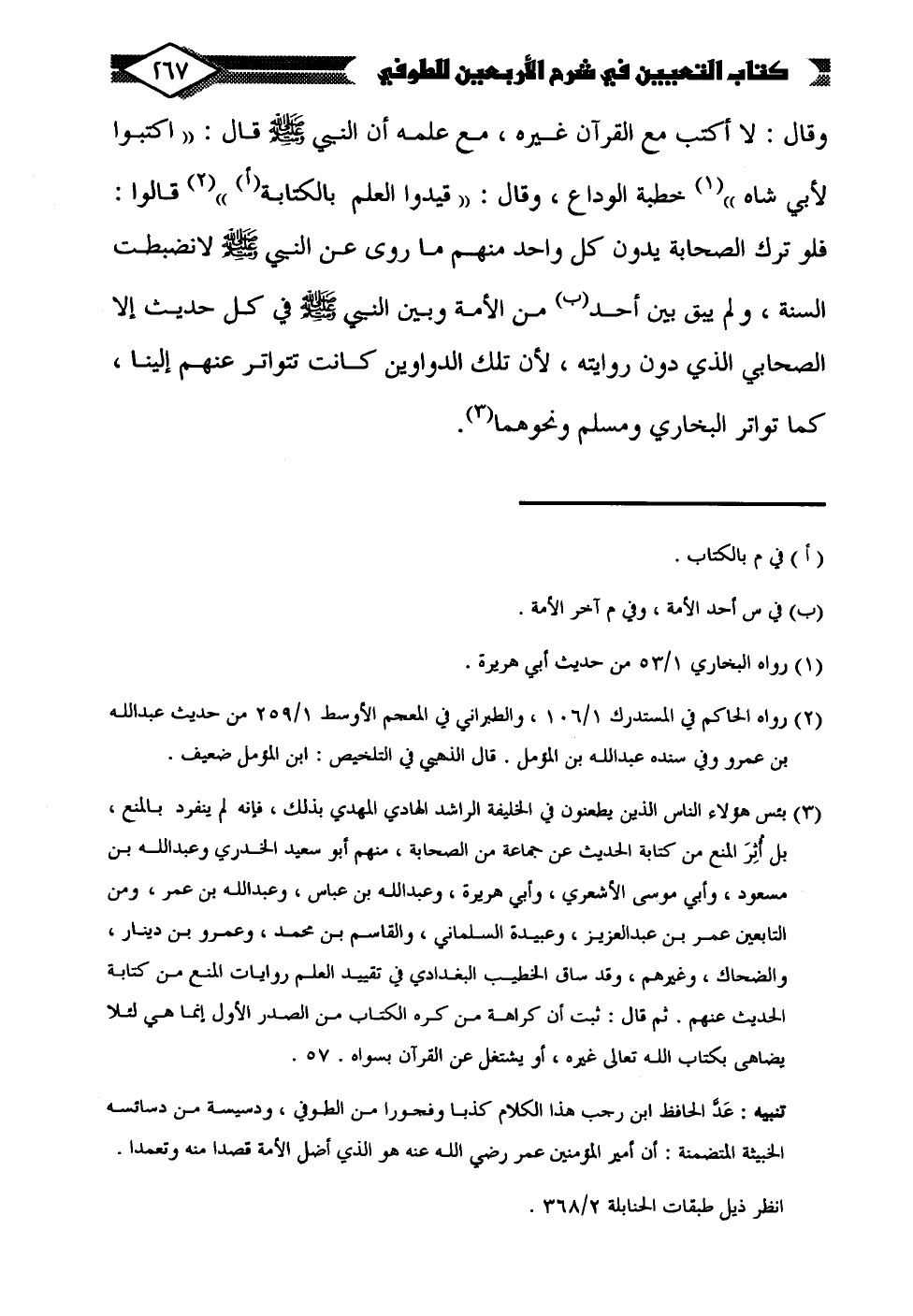 (¬3) بئس هؤلاء الناس الذين يطعنون في الخليفة الراشد الهادي المهدي بذلك، فإنه لم ينفرد بالمنع، بل أُثِرَ المنع من كتابة الحديث عن جماعة من الصحابة، منهم أبو سعيد الخدري وعبد الله بن مسعود، وأبي موسى الأشعري، وأبي هريرة، وعبد الله بن عباس، وعبد الله بن عمر، ومن التابعين عمر بن عبد العزيز، وعبيدة السلماني، والقاسم بن محمد، وعمرو بن دينار، والضحاك، وغيرهم، وقد ساق الخطيب البغدادي في تقييد العلم روايات المنع من كتابة الحديث عنهم. ثم قال: ثبت أن كراهة من كره الكتاب من الصدر الأول إنما هي لئلا يضاهى بكتاب الله تعالى غيره، أو يشتغل عن القرآن بسواه. 57.