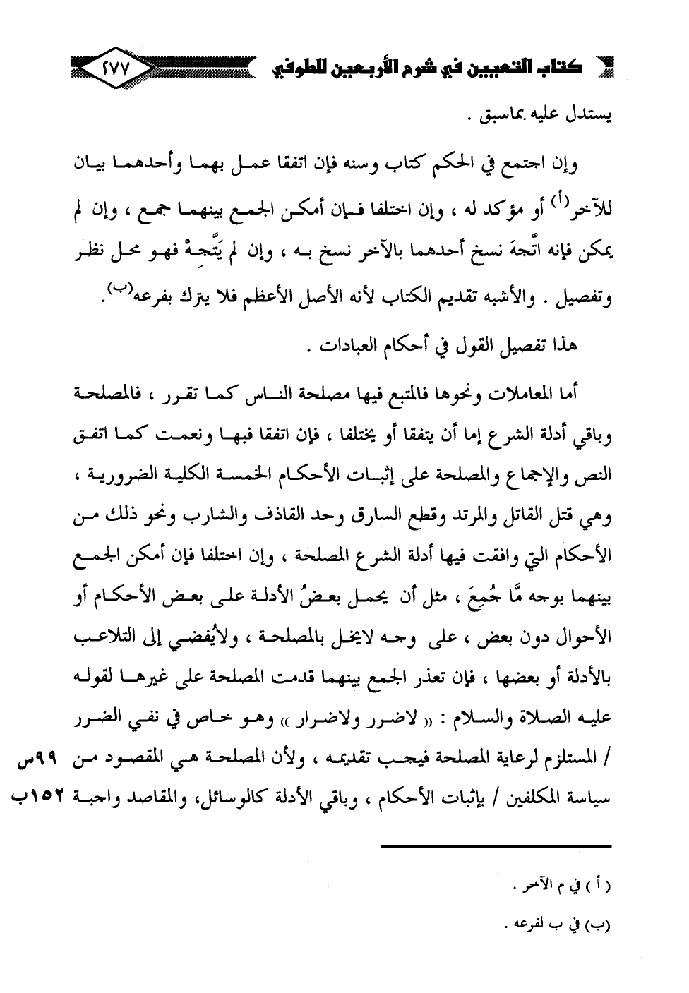 أما المعاملات ونحوها فالمتبع فيها مصلحة الناس كما تقرر، فالمصلحة وباقي أدلة الشرع إما أن يتفقا أو يختلفا، فإن اتفقا فبها ونعمت كما اتفق النص والإجماع والمصلحة على إثبات الأحكام الخمسة الكلية الضرورية، وهي قتل القاتل والمرتد وقطع السارق وحد القاذف والشارب ونحو ذلك من الأحكام التي وافقت فيها أدلة الشرع المصلحة، وإن اختلفا فإن أمكن الجمع بينهما بوجه ما جُمِعَ، مثل أن يحمل بعضُ الأدلة على بعض الأحكام أو الأحوال دون بعض، على وجه لا يخل بالمصلحة، ولا يُفضي إلى التلاعب بالأدلة أو بعضها، فإن تعذر الجمع بينهما قدمت المصلحة على غيرها لقوله عليه الصلاة والسلام: "لا ضرر ولا ضرار" وهو خاص في نفي الضرر المستلزم لرعاية المصلحة فيجب تقديمه، ولأن المصلحة هي المقصود من سياسة المكلفين بإثبات الأحكام، وباقي الأدلة كالوسائل، والمقاصد واجبة