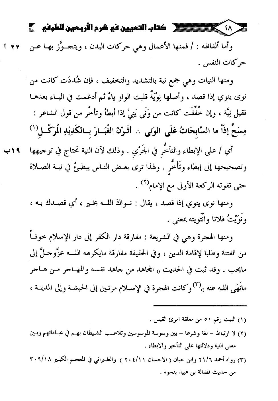 ومنها النيات وهي جمع نية بالتشديد والتخفيف، فإنَّ شُددَت كانت من نوى ينوي إذا قصد، وأصلها نِوْيَةٌ قلبت الواو ياءً ثم أدغمت في الياء بعدها فقيل نِيَّة، وإن خُفِّفَت كانت من وَنَى يَنِيْ إذا أبطأ وتأخر من قول الشاعر: