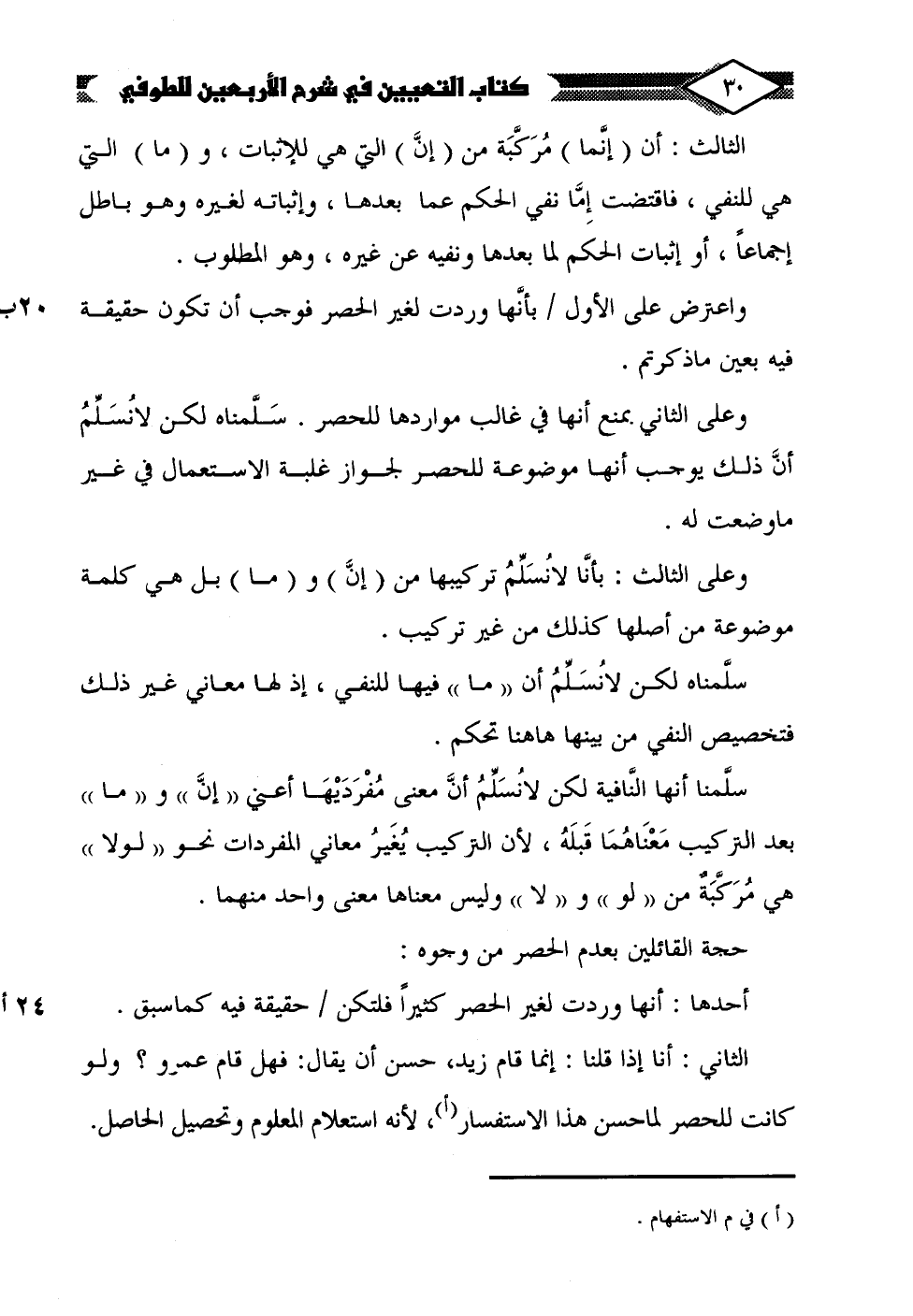 الثَّاني: أنا إذا قلنا: إنَّما قام زيد، حسن أن يقال: فهل قام عمرو؟ ولو كانت للحصر لما حسن هذا الاستفسار (أ)، لأنَّه استعلام المعلوم وتحصيل الحاصل.