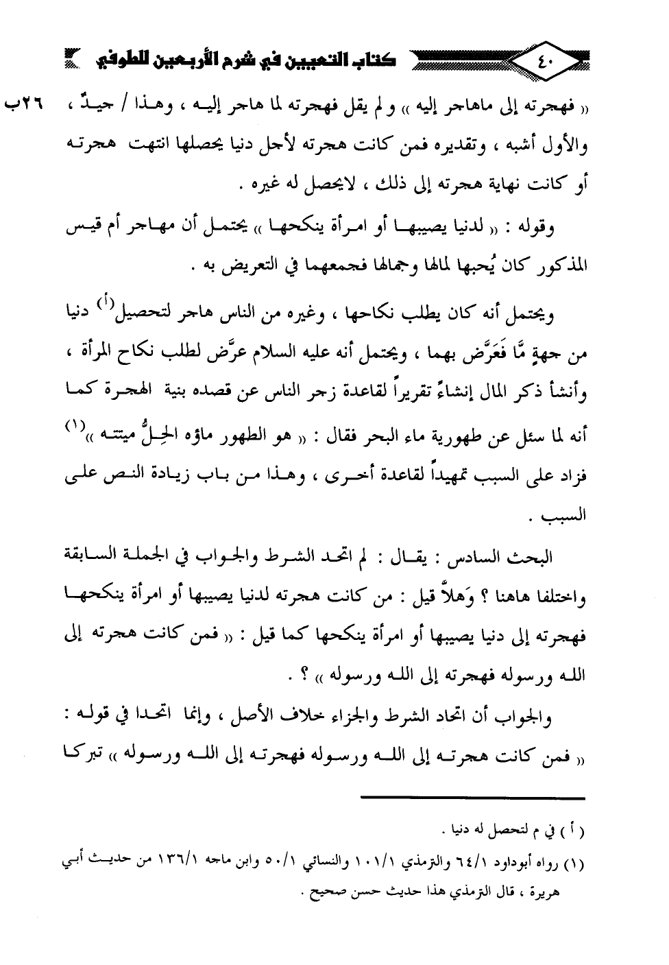 "فهجرته إلى ما هاجر إليه" ولم يقل فهجرته لما هاجر إليه، وهذا جيدٌ، والأول أشبه، وتقديره فمن كانت هجرته لأجل دنيا يحصلها انتهت هجرته أو كانت نهاية هجرته إلى ذلك، لا يحصل له غيره.