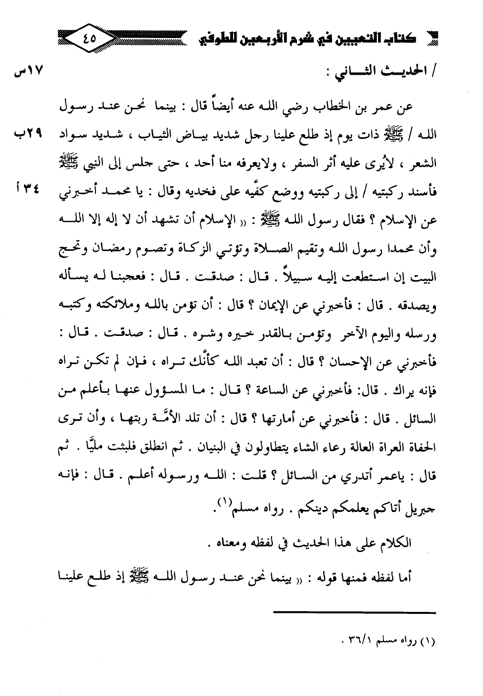 عن عمر بن الخطاب رضي الله عنه أيضًا قال: بينما نحن عند رسول الله - صلى الله عليه وسلم - ذات يوم إذ طلع علينا رجل شديد بياض الثياب، شديد سواد الشعر، لا يُرى عليه أثر السفر، ولا يعرفه منا أحد، حتَّى جلس إلى النَّبيِّ - صَلَّى الله عليه وسلم - فأسند ركبتيه إلى ركبتيه ووضع كفَّيه على فخديه وقال: يا محمد أخبرني عن الإسلام؟ فقال رسول الله - صَلَّى الله عليه وسلم -: "الإسلام أن تشهد أن لا إله إلَّا الله وأن محمدًا رسول الله وتقيم الصَّلاة وتؤتي الزكاة وتصوم رمضان وتحج البيت إن استطعت إليه سبيلًا. قال: صدقت. قال: فعجبنا له يسأله ويصدقه. قال: فأخبرني عن الإيمان؟ قال: أن تؤمن بالله وملائكته وكتبه ورسله واليوم الآخر وتؤمن بالقدر خيره وشره. قال: صدقت. قال: فأخبرني عن الإحسان؟ قال: أن تعبد الله كأنك تراه، فإنَّ لم تكن تراه فإنَّه يراك. قال: فأخبرني عن الساعة؟ قال: ما المسؤول عنها بأعلم من السائل. قال: فأخبرني عن أمارتها؟ قال: أن تلد الأمَّة ربتها، وأن ترى الحفاة العراة العالة رعاء الشاء يتطاولون في البنيان. ثم انطلق فلبثت مليًّا. ثم قال: يا عمر أتدري من السائل؟ قلت: الله ورسوله أعلم. قال: فإنَّه جبريل أتاكم يعلمكم دينكم. رواه مسلم (¬1).