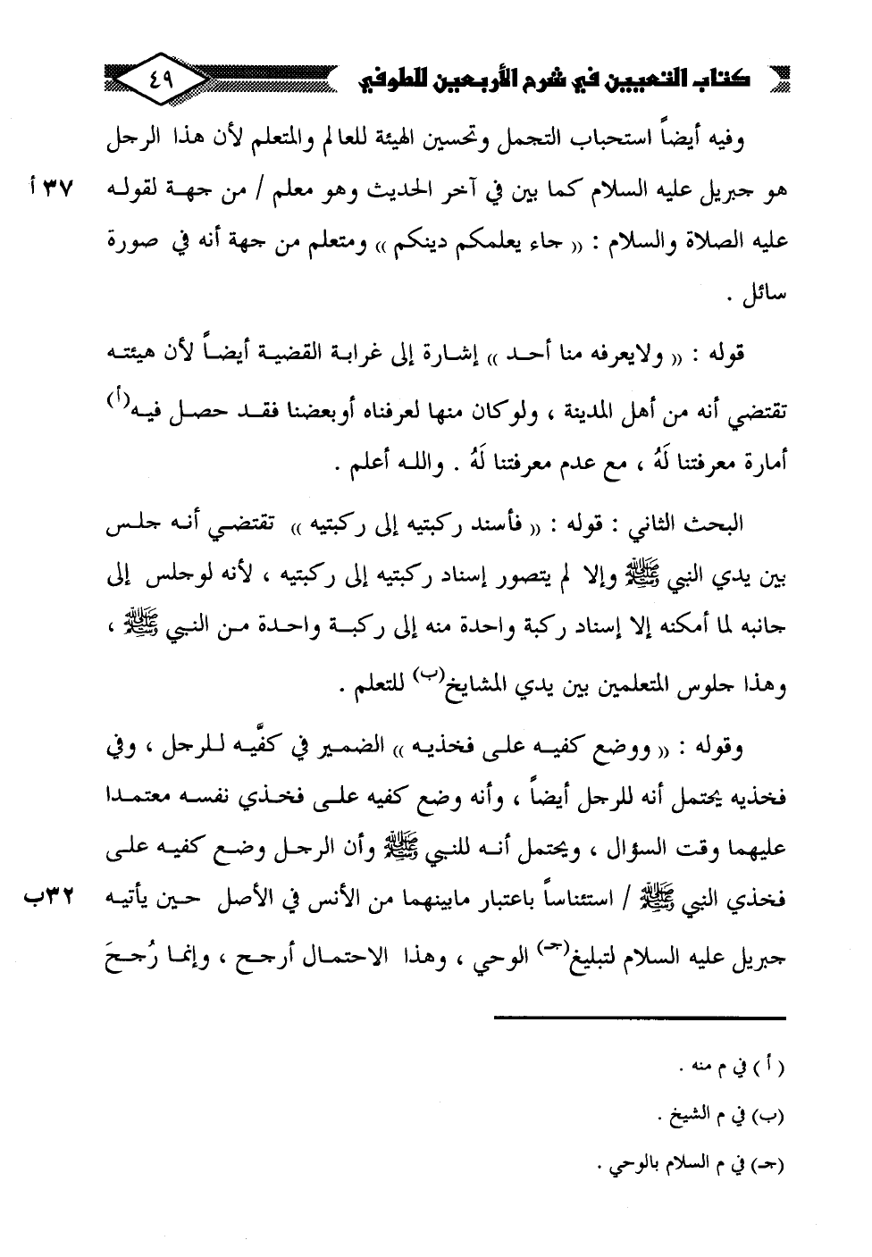 البحث الثاني: قوله: "فأسند ركبتيه إلى ركبتيه" تقتضي أنه جلس بين يدي النبي - صلى الله عليه وسلم - وإلا لم يتصور إسناد ركبتيه إلى ركبتيه، لأنه لو جلس إلى جانبه لما أمكنه إلا إسناد ركبة واحدة منه إلى ركبة واحدة من النبي - صلى الله عليه وسلم -، وهذا جلوس المتعلمين بين يدي المشايخ (ب) للتعلم.