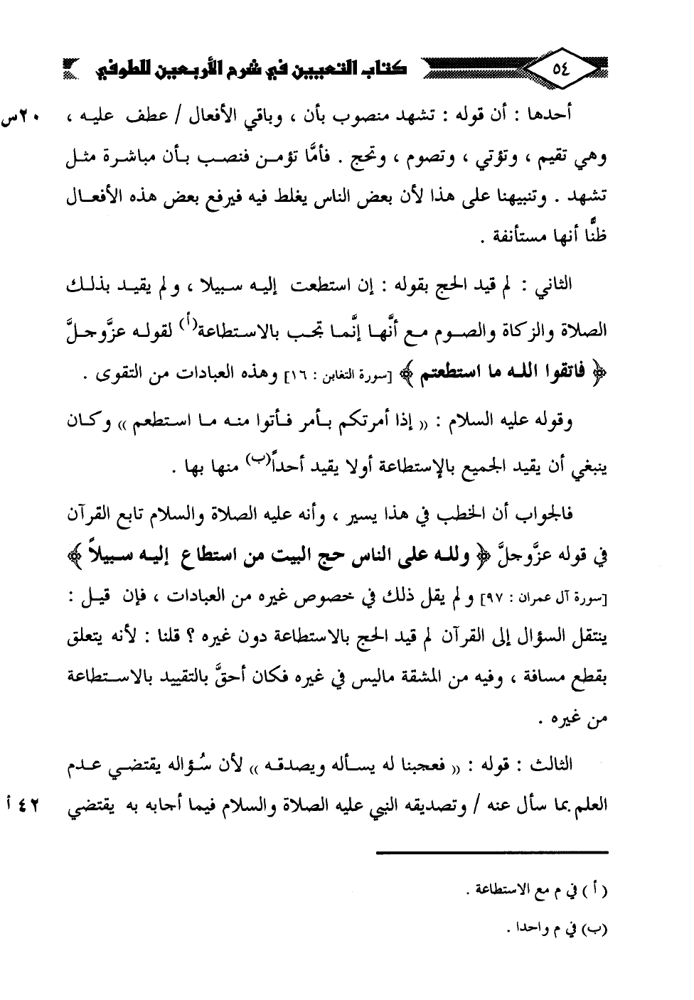 وقوله - عليه السلام -: "إذا أمرتكم بأمر فأتوا منه ما استطعم" وكان ينبغي أن يقيد الجميع بالإستطاعة أولًا يقيد أحدًا (ب) منها بها.