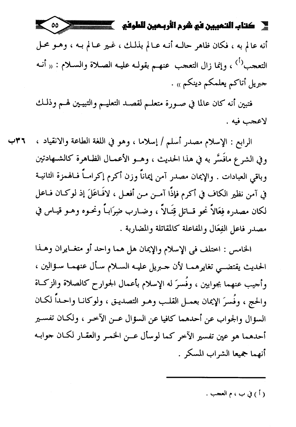 الخامس: اختلف في الإسلام والإيمان هل هما واحد أو متغايران وهذا الحديث يقتضي تغايرهما لأن حبريل - عليه السلام - سأل عنهما سؤالين، وأجيب عنهما بجوابين، وفُسرَ له الإسلام بأعمال الجوارح كالصلاة والزكاة والحج، وفُسرَ الإيمان بعمل القلب وهو التصديق، ولو كانا واحدًا لكان السؤال والجواب عن أحدهما كافيا عن السؤال عن الآخر، ولكان تفسير أحدهما هو عين تفسير الآخر كما لو سأل عن الخمر والعقار لكان حوابه أنهما جميعا الشراب المسكر.