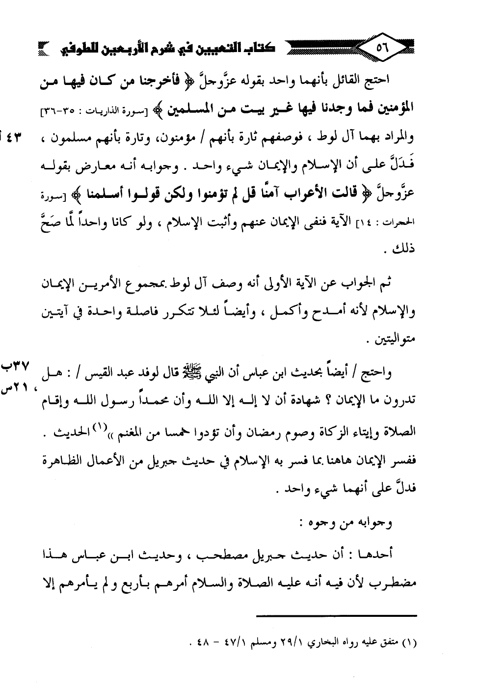 احتج القائل بأنهما واحد بقوله عزَّ وجلَّ {فَأَخْرَجْنَا مَنْ كَانَ فِيهَا مِنَ الْمُؤْمِنِينَ (35) فَمَا وَجَدْنَا فِيهَا غَيْرَ بَيْتٍ مِنَ الْمُسْلِمِينَ} [الذاريات: 35، 36] والمراد بهما آل لوط، فوصفهم تارة بأنهم مؤمنون، وتارة بأنهم مسلمون، فَدَلَّ على أن الإسلام والإيمان شيء واحد. وحوابه أنه معارض بقوله عزَّ وجلَّ {قالت الأعراب آمنّا قل لم تؤمنوا ولكن قولوا أسلمنا} [سورة الحجرات: 14] الآية فنفى الإيمان عنهم وأثبت الإسلام، ولو كانا واحدًا لمّا صَحَّ ذلك.