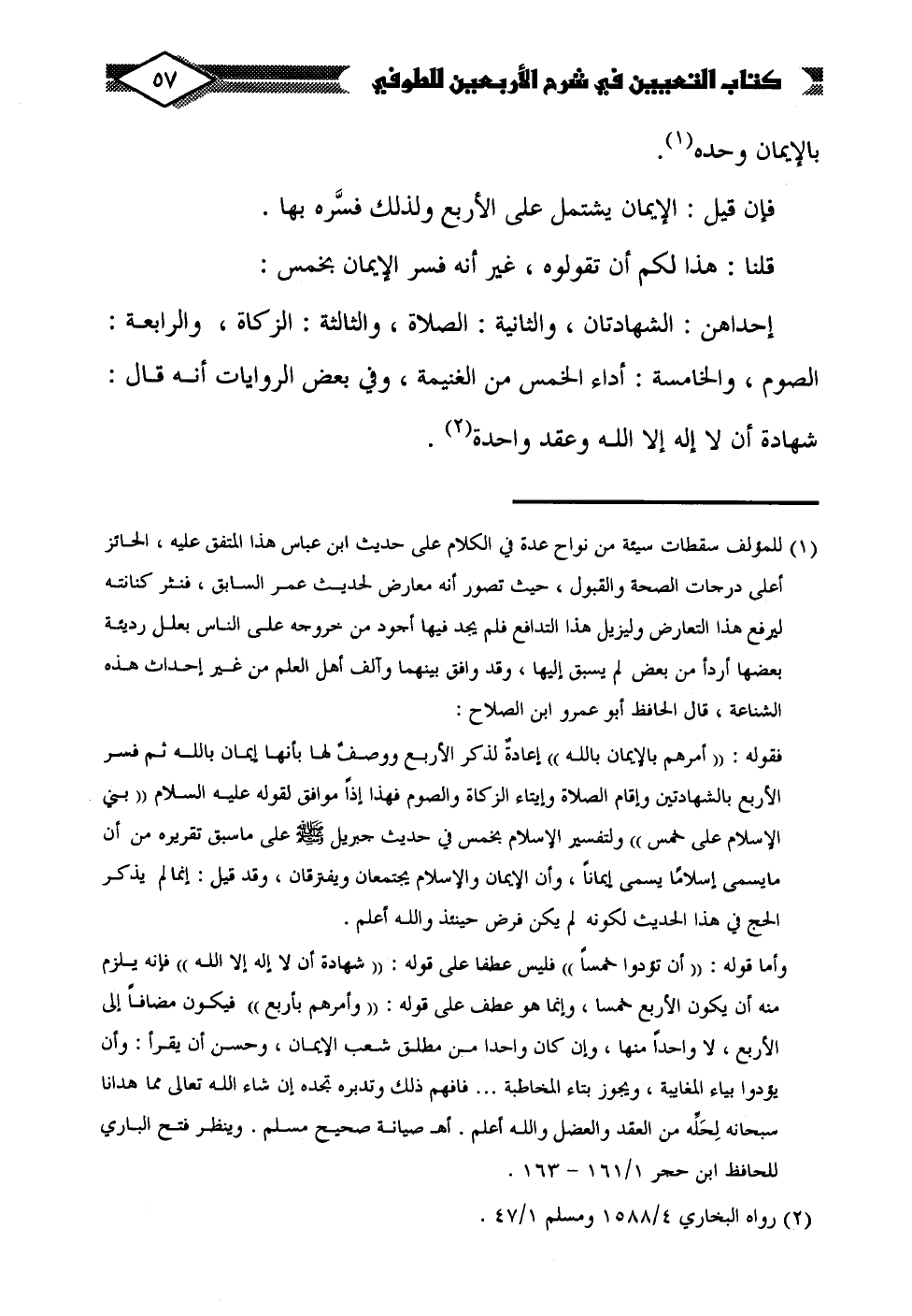 وأما قوله: "أن تؤدوا خمسًا" فليس عطفًا على قوله: "شهادة أن لا إله إلا الله" فإنه يلزم منه أن يكون الأربع خمسًا، وإنما هو عطف على قوله: "وأمرهم بأربع" فيكون مضافًا إلى الأربع، لا واحدًا منها، وإن كان واحدا من مطلق شعب الإيمان, وحسن أن يقرأ: وأن يؤدوا بياء المغايبة، ويجوز بتاء المخاطبة ... فافهم ذلك وتدبره تجده إن شاء الله تعالى مما هدانا سبحانه لِحَلِّه من العقد والعضل والله أعلم. أهـ صيانة صحيح مسلم. وينظر فتح الباري للحافظ ابن حجر 1/ 161 - 163.