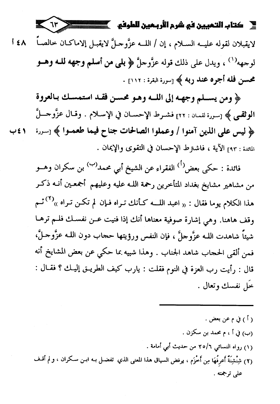 فائدة: حكى بعض (أ) الفقراء عن الشيخ أبي محمد (ب) بن سكران وهو من مشاهير مشايخ بغداد المتأخرين رحمة الله عليه وعليهم أجمعين أنه ذكر هذا الكلام يوما فقال: "اعبد الله كأنك تراه فإن لم تكن تراه" (¬2) ثم وقف هاهنا. وهي إشارة صوفية معناها أنك إذا فنيت عن نفسك فلم ترها شيئًا شاهدت الله عزَّ وجلَّ، فإن النفس ورؤيتها حجاب دون الله عزَّ وجلَّ، فمن ألقى الحجاب شاهد الجناب. وهذا شبيه بما حكي عن بعض المشايخ أنه قال: رأيت رب العزة في النوم فقلت: يا رب كيف الطريق إليك؟ فقال: خَل نفسك وتعال.