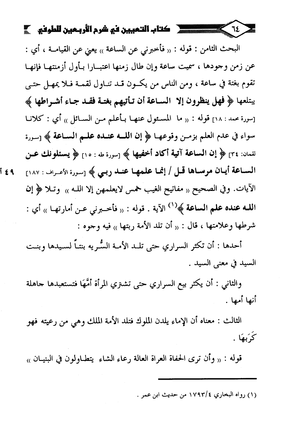 البحث الثامن: قوله: "فأخبرني عن الساعة" يعني عن القيامة، أي: عن زمن وجودها، سميت ساعة وإن طال زمنها اعتبارا بأول أزمنتها فإنها تقوم بغتة في ساعة، ومن الناس من يكون قد تناول لقمة فلا يمهل حتى يبتلعها {فهل ينظرون إلا الساعة أن تأتيهم بغتة فقد جاء أشراطها} [سورة محمد: 18] قوله: "ما المسئول عنها بأعلم من السائل" أي: كلانا سواء في عدم العلم بزمن وقوعها {إن الله عنده علم الساعة} [سورة لقمان: 34] {إن الساعة آتية أكاد أخفيها} [سورة طه: 15] {يسئلونك عن الساعة أيان مرساها قل إنما علمها عند ربي} [سورة الأعراف: 187] الآيات. وفي الصحيح "مفاتيح الغيب خمس لا يعلمهن إلا الله" وتلا {إن الله عنده علم الساعة} (¬1) الآية. قوله: "فأخبرني عن أمارتها" أي: شرطها وعلامتها، قال: "أن تلد الأمة ربتها" فيه وجوه: