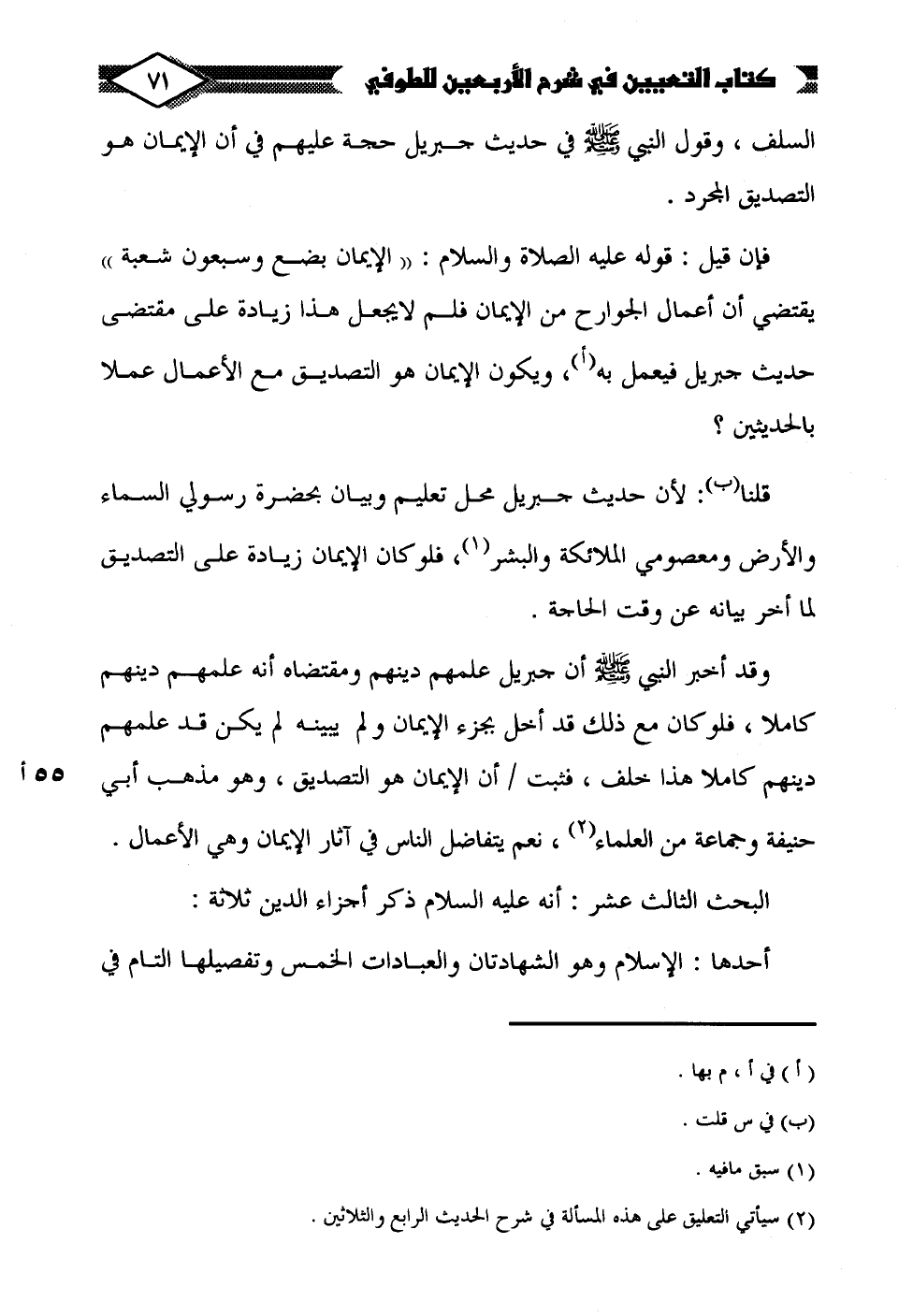 قلنا (ب): لأن حديث جبريل محل تعليم وبيان بحضرة رسولي السماء والأرض ومعصومي الملائكة والبشر (¬1)، فلو كان الإيمان زيادة على التصديق لما أخر بيانه عن وقت الحاجة.