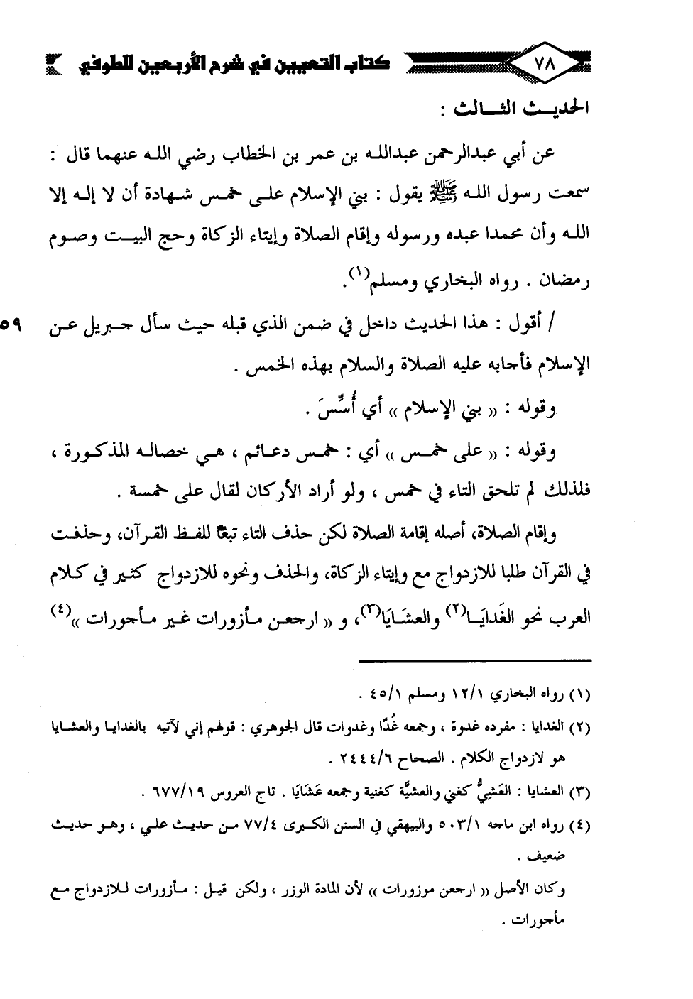 عن أبي عبد الرحمن عبد الله بن عمر بن الخطاب رضي الله عنهما قال: سمعت رسول الله - صلى الله عليه وسلم - يقول: بني الإسلام على خمس شهادة أن لا إله إلا الله وأن محمدا عبده ورسوله وإقام الصلاة وإيتاء الزكاة وحج البيت وصوم رمضان. رواه البخاري ومسلم (¬1).