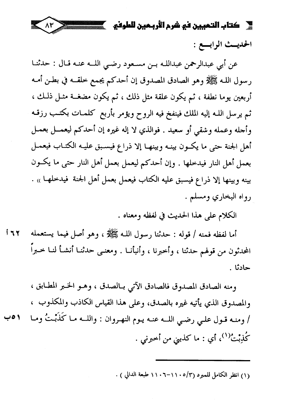 عن أبي عبد الرحمن عبد الله بن مسعود رضي الله عنه قال: حدثنا رسول الله - صلى الله عليه وسلم - وهو الصادق المصدوق إن أحدكم مجمع خلقه في بطن أمه أربعين يوما نطفة، ثم يكون علقة مثل ذلك، ثم يكون مضغة مثل ذلك، ثم يرسل الله إليه الملك فينفخ فيه الروح ويؤمر بأربع كلمات بكتب رزقه وأجله وعمله وشقي أو سعيد. فوالذي لا إله غيره إن أحدكم ليعمل بعمل أهل الجنة حتى ما يكون بينه وبينها إلا ذراع فيسبق عليه الكتاب فيعمل بعمل أهل النار فيدخلها. وإن أحدكم ليعمل بعمل أهل النار حتى ما يكون بينه وبينها إلا ذراع فيسبق عليه الكتاب فيعمل بعمل أهل الجنة فيدخلها".