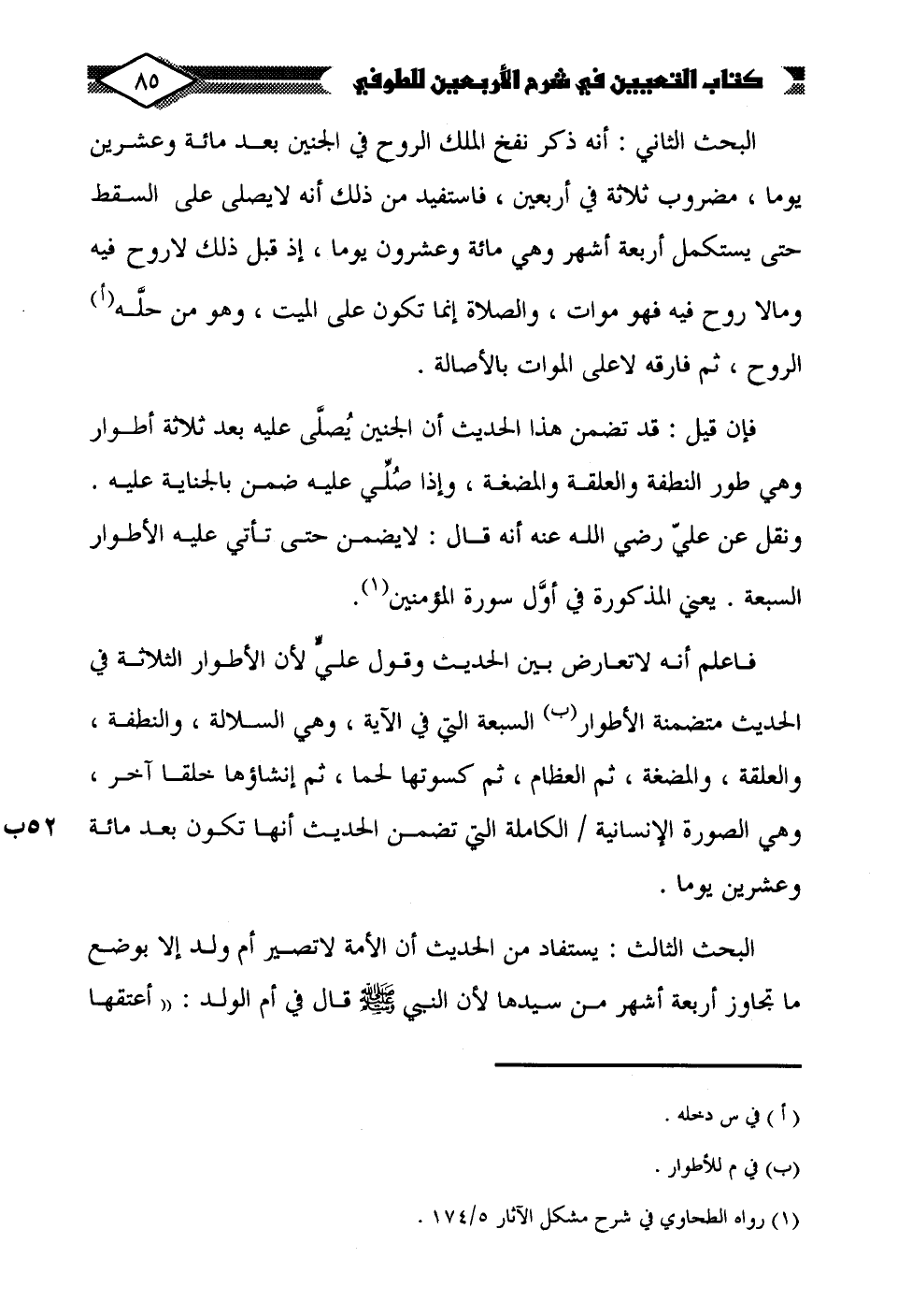 البحث الثاني: أنه ذكر نفخ الملك الروح في الجنين بعد مائة وعشرين يوما، مضروب ثلاثة في أربعين، فاستفيد من ذلك أنه لا يصلى على السقط حتى يستكمل أربعة أشهر وهي مائة وعشرون يوما، إذ قبل ذلك لا روح فيه وما لا روح فيه فهو موات، والصلاة إنما تكون على الميت، وهو من حلَّه (أ) الروح، ثم فارقه لا على الموات بالأصالة.