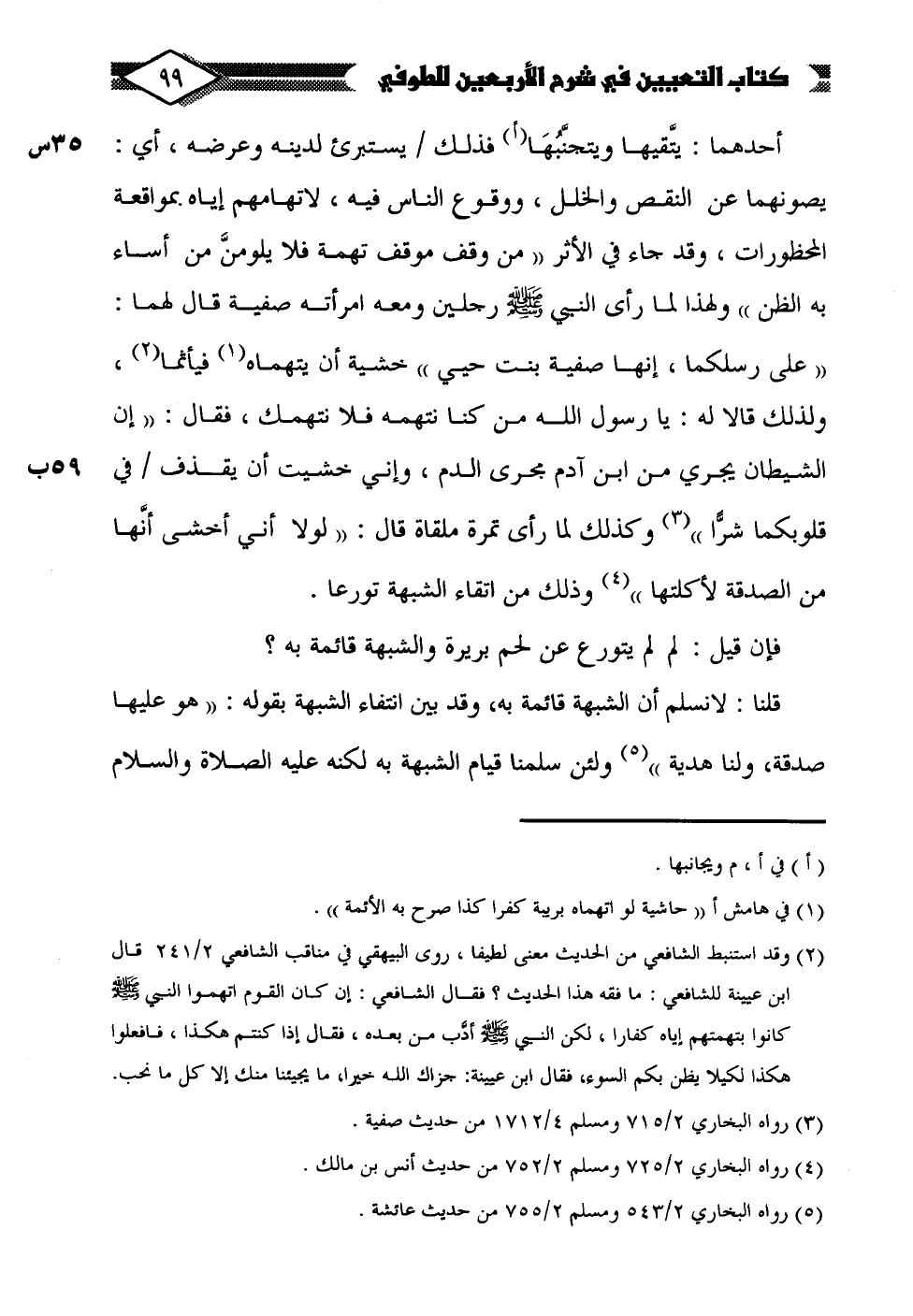 (¬2) وقد استنبط الشافعي من الحديث معنى لطيفا، روى البيهقي في مناقب الشافعي 2/ 241 قال ابن عيينة للشافعي: ما فقه هذا الحديث؟ فقال الشافعي: إن كان القوم اتهموا النبي - صلى الله عليه وسلم - كانوا بتهمتهم إياه كفارا، لكن النبي - صلى الله عليه وسلم - أدَّبَ من بعده، فقال إذا كنتم هكذا، فافعلوا هكذا لكيلا يظن بكم السوء، فقال ابن عيينة: جزاك الله خيرا، ما يجيئنا منك إلا كل ما نحب.