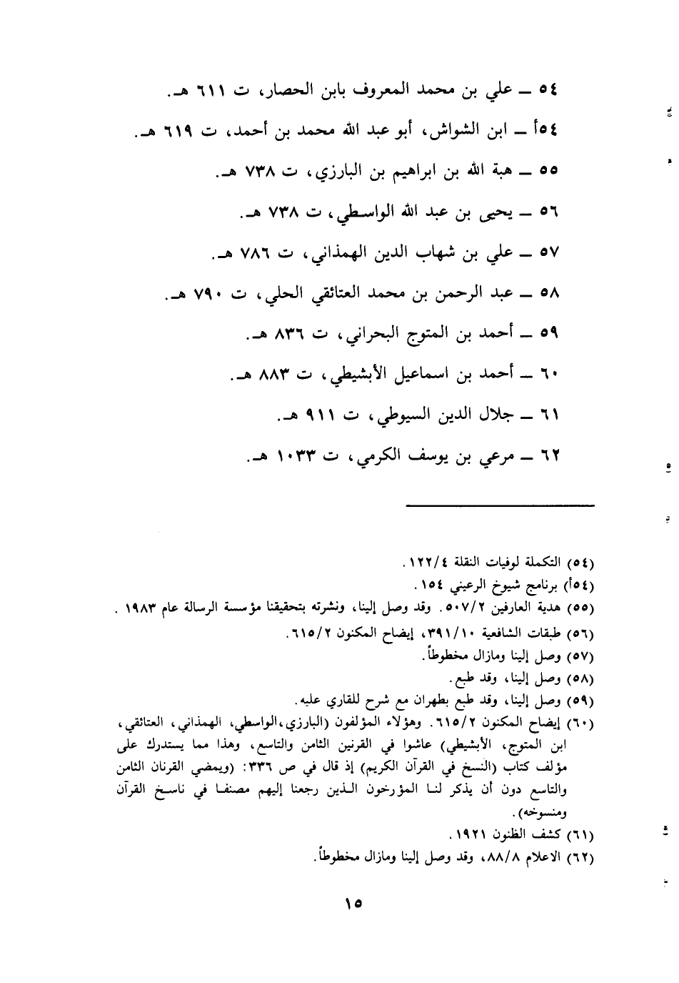 وهؤلاء المؤلفون (البارزى، الواسطى، الهمذانى، العتائقى، ابن المتوج، الابشيطى) عاشوا في القرنين الثامن والتاسع، وهذا مما يستدرك على مؤلف كتاب (النسخ في القرآن الكريم) اذ قال في ص 336: (ويمضى القرنان الثامن والتاسع دون أن يذكر لنا المؤرخون الذين رجعنا اليهم مصنفا في ناسخ القرآن ومنسوخه) .