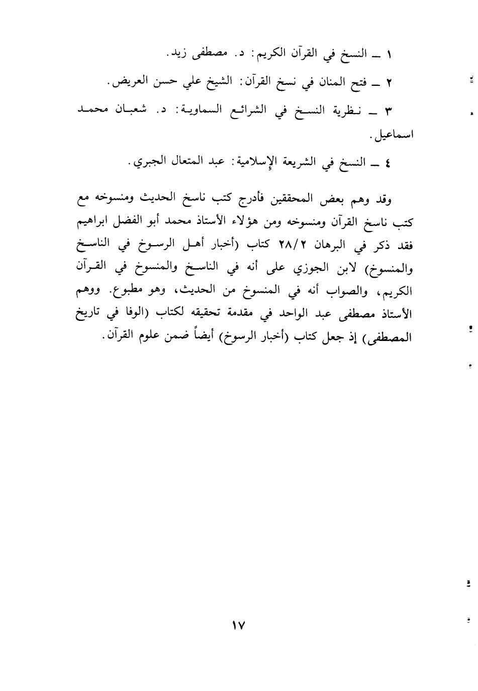 وقد وهم بعض المحققين فأدرج كتب ناسخ الحديث ومنسوخه مع كتب ناسخ القرآن ومنسوخه ومن هؤلاء الاستاذ محمد أبوالفضل ابراهيم