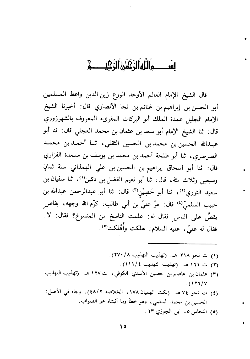 بسم الله الرحمن الرحيم قال الشيخ الإمام العالم الأوحد الورع زين الدين واعظ المسلمين أبو الحسن ابن إبراهيم بن غنائم بن نجا الأنصاري قال: أخبرنا الشيخ الإمام الجليل عمدة الملك أبو البركات المقرئ المعروف بالشهرزوري قال: ثنا الشيخ الإمام ابو سعد ابن عثمان بن محمد العجلي قال: ثنا أبو عبد الله الحسين بن محمد بن الحسين الثقفي، ثنا أحمد بن محمد الصرصري، ثنا أبو طلحة أحمد بن محمد بن يوسف ابن مسعدة الفزاري قال: ثنا أبو اسحاق إبراهيم بن الحسين بن علي الهمذاني