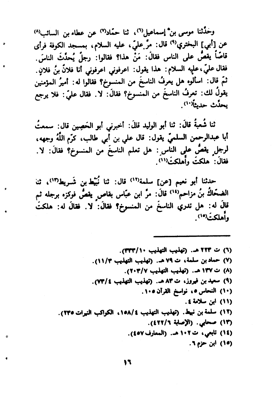 ثنا شعبة قال: ثنا أبو الوليد قال: أخبرني أبو الحصين قال: سمعت أبا عبد الرحمن السلميّ يقول: قال علي بن أبي طالب، كرّم الله وجهه، لرجل يقصّ على الناس: هل تعلم الناسخ من المنسوخ؟ فقال: لا. فقال: هلكت وأهلكت (¬11).