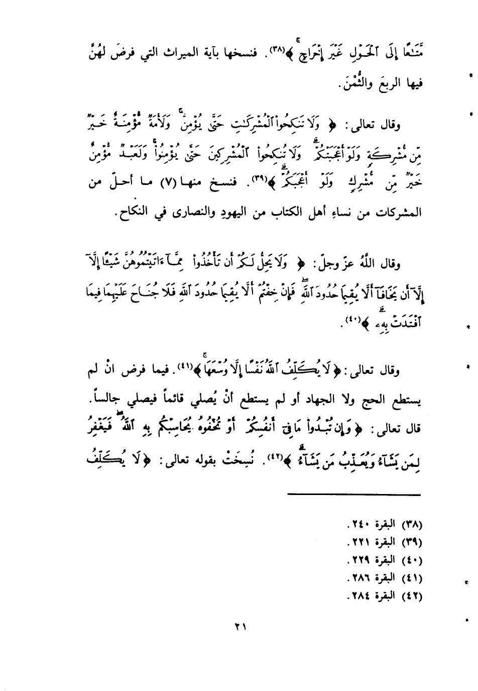 {وَإِنْ تُبْدُوا ما فِي أَنْفُسِكُمْ أَوْ تُخْفُوهُ يُحاسِبْكُمْ بِهِ اللهُ فَيَغْفِرُ لِمَنْ يَشاءُ وَيُعَذِّبُ مَنْ يَشاءُ} (¬42) نسخت بقوله تعالى: {لا يُكَلِّفُ