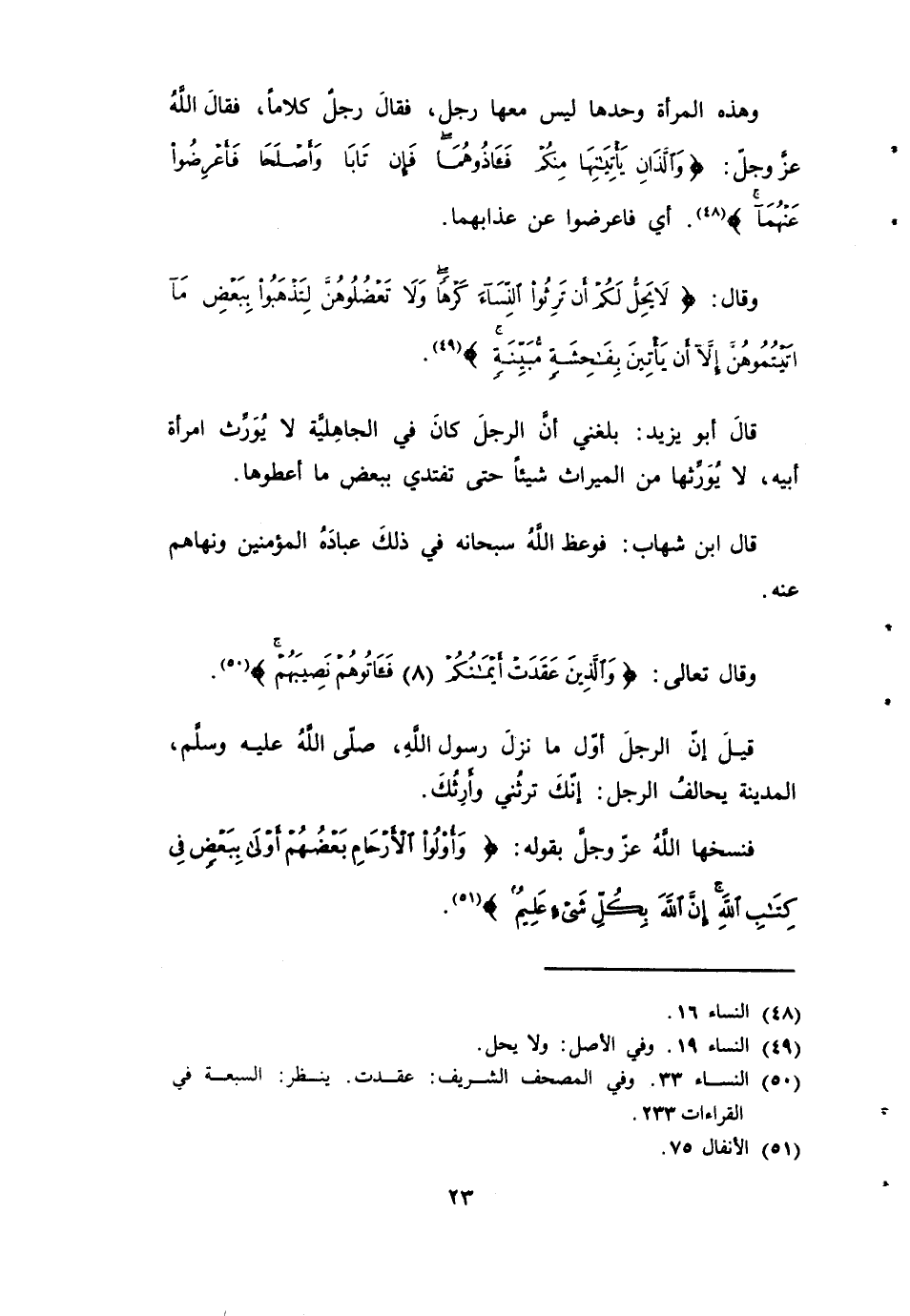 وقال: لا يَحِلُّ لَكُمْ أَنْ تَرِثُوا النِّساءَ كَرْهاً وَلا تَعْضُلُوهُنَّ لِتَذْهَبُوا بِبَعْضِ ما آتَيْتُمُوهُنَّ إِلَّا أَنْ يَأْتِينَ بِفاحِشَةٍ مُبَيِّنَةٍ (¬49).
