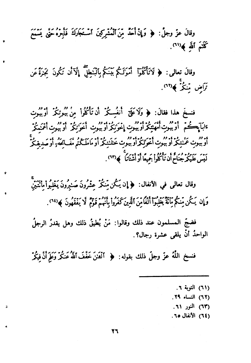 فنسخ هذا فقال: {وَلا عَلى أَنْفُسِكُمْ أَنْ تَأْكُلُوا مِنْ بُيُوتِكُمْ أَوْ بُيُوتِ آبائِكُمْ أَوْ بُيُوتِ أُمَّهاتِكُمْ أَوْ بُيُوتِ إِخْوانِكُمْ أَوْ بُيُوتِ أَخَواتِكُمْ أَوْ بُيُوتِ أَعْمامِكُمْ أَوْ بُيُوتِ عَمَّاتِكُمْ أَوْ بُيُوتِ أَخْوالِكُمْ أَوْ بُيُوتِ خالاتِكُمْ أَوْ ما مَلَكْتُمْ مَفاتِحَهُ أَوْ صَدِيقِكُمْ لَيْسَ عَلَيْكُمْ جُناحٌ أَنْ تَأْكُلُوا جَمِيعاً أَوْ أَشْتاتاً} (¬63).