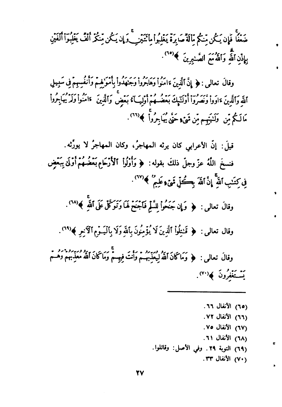 وقال تعالى: {إِنَّ الَّذِينَ آمَنُوا وَهاجَرُوا وَجاهَدُوا بِأَمْوالِهِمْ وَأَنْفُسِهِمْ فِي سَبِيلِ اللهِ وَالَّذِينَ آوَوْا وَنَصَرُوا أُولئِكَ بَعْضُهُمْ أَوْلِياءُ بَعْضٍ وَالَّذِينَ آمَنُوا وَلَمْ يُهاجِرُوا ما لَكُمْ مِنْ وَلايَتِهِمْ مِنْ شَيْءٍ حَتَّى يُهاجِرُوا} (¬66).