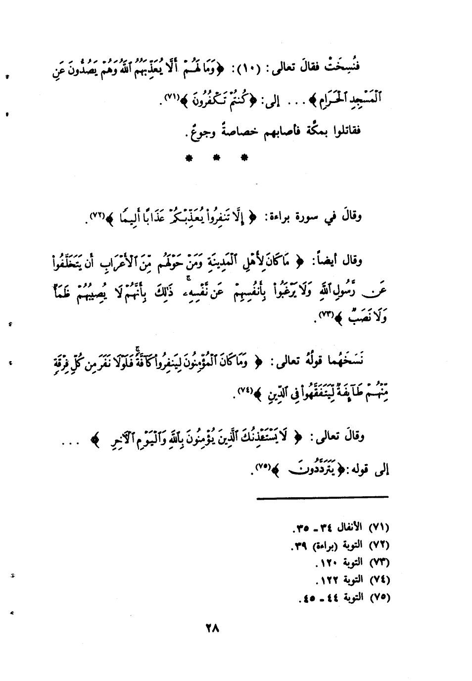 نسخهما قوله تعالى: {وَما كانَ الْمُؤْمِنُونَ لِيَنْفِرُوا كَافَّةً فَلَوْلا نَفَرَ مِنْ كُلِّ فِرْقَةٍ مِنْهُمْ طائِفَةٌ لِيَتَفَقَّهُوا فِي الدِّينِ} (¬74).