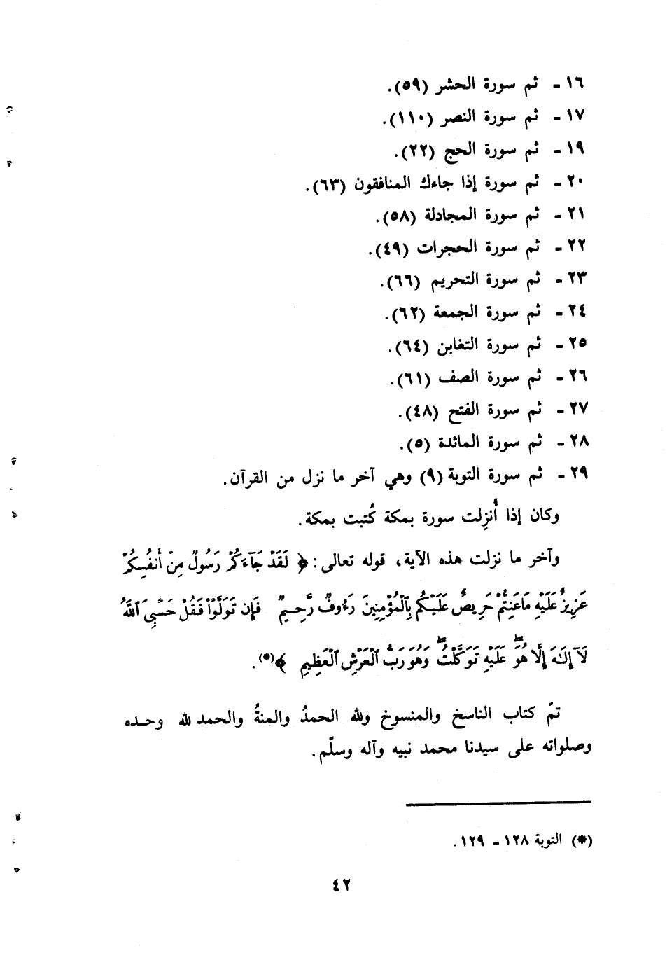 تمّ كتاب الناسخ والمنسوخ ولله الحمد والمنة والحمد لله وحده وصلواته على سيدنا محمد نبيه وآله وسلّم.