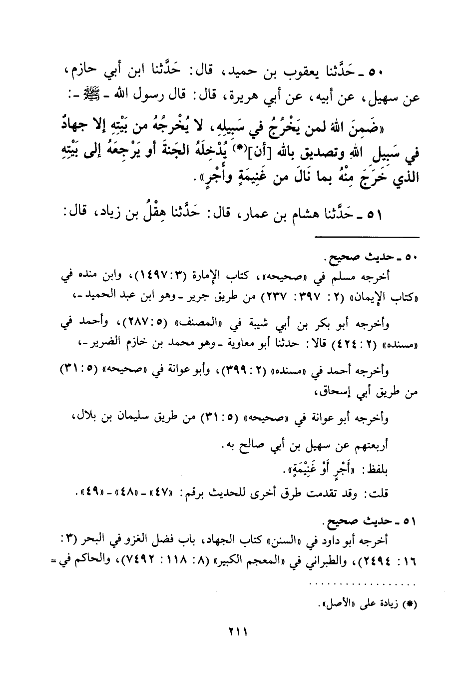50 - حَدَّثَنَا يَعْقُوبُ بْنُ حُمَيْدٍ، قَالَ: حَدَّثَنَا ابْنُ أَبِي حَازِمٍ، عَنْ سُهَيْلٍ، عَنْ أَبِيهِ، عَنْ أَبِي هُرَيْرَةَ قَالَ: قَالَ رَسُولُ اللَّهِ صَلَّى اللهُ عَلَيْهِ وَسَلَّمَ: «§ضَمِنَ اللَّهُ لِمَنْ يَخْرُجُ فِي سَبِيلِهِ، لَا يُخْرِجُهُ مِنْ بَيْتِهِ إِلَّا جِهَادٌ فِي سَبِيلِ اللَّهِ وَتَصْدِيقٌ بِاللَّهِ، أَنْ يُدْخِلَهُ الْجَنَّةَ، أَوْ يُرْجِعَهُ إِلَى بَيْتِهِ الَّذِي خَرَجَ مِنْهُ بِمَا نَالَ مِنْ غَنِيمَةٍ وَأَجْرٍ»