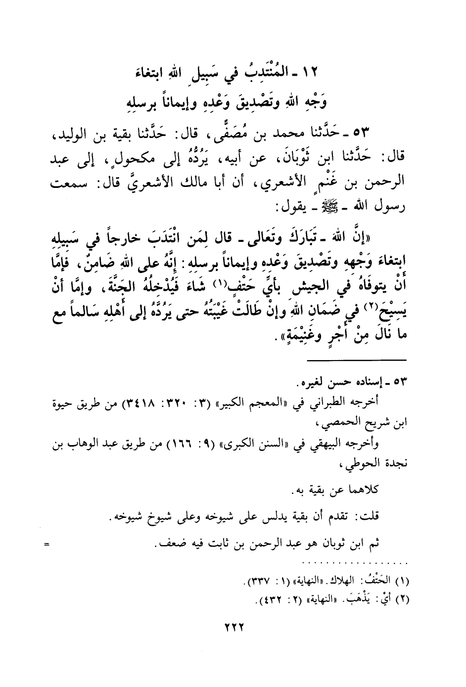 53 - حَدَّثَنَا مُحَمَّدُ بْنُ مُصَفًّى، قَالَ: حَدَّثَنَا بَقِيَّةُ بْنُ الْوَلِيدِ، قَالَ: حَدَّثَنَا ابْنُ ثَوْبَانَ، عَنْ أَبِيهِ، يَرُدُّهُ إِلَى مَكْحُولٍ إِلَى عَبْدِ الرَّحْمَنِ بْنِ غَنْمٍ الْأَشْعَرِيِّ، أَنَّ أَبَا مَالِكٍ الْأَشْعَرِيَّ قَالَ: سَمِعْتُ رَسُولَ اللَّهِ صَلَّى اللهُ عَلَيْهِ وَسَلَّمَ يَقُولُ: «إِنَّ §اللَّهَ تَبَارَكَ وَتَعَالَى قَالَ لِمَنِ انْتُدِبَ خَارِجًا فِي سَبِيلِهِ ابْتِغَاءَ وَجْهِهِ، وَتَصْدِيقَ وَعْدِهِ، وَإِيمَانًا بِرُسُلِهِ، إِنَّهُ عَلَى اللَّهِ ضَامِنٌ، فَإِمَّا أَنْ يَتَوَفَّاهُ فِي الْجَيْشِ بِأَيِّ حَتْفٍ شَاءَ فَيُدْخِلُهُ الْجَنَّةَ، وَإِمَّا أَنْ يَسِيحَ فِي ضَمَانِ اللَّهِ، وَإِنْ طَالَتْ غَيْبَتُهُ حَتَّى يَرُدَّهُ إِلَى أَهْلِهِ سَالِمًا مَعَ مَا نَالَ مِنْ أَجْرٍ وَغَنِيمَةٍ»