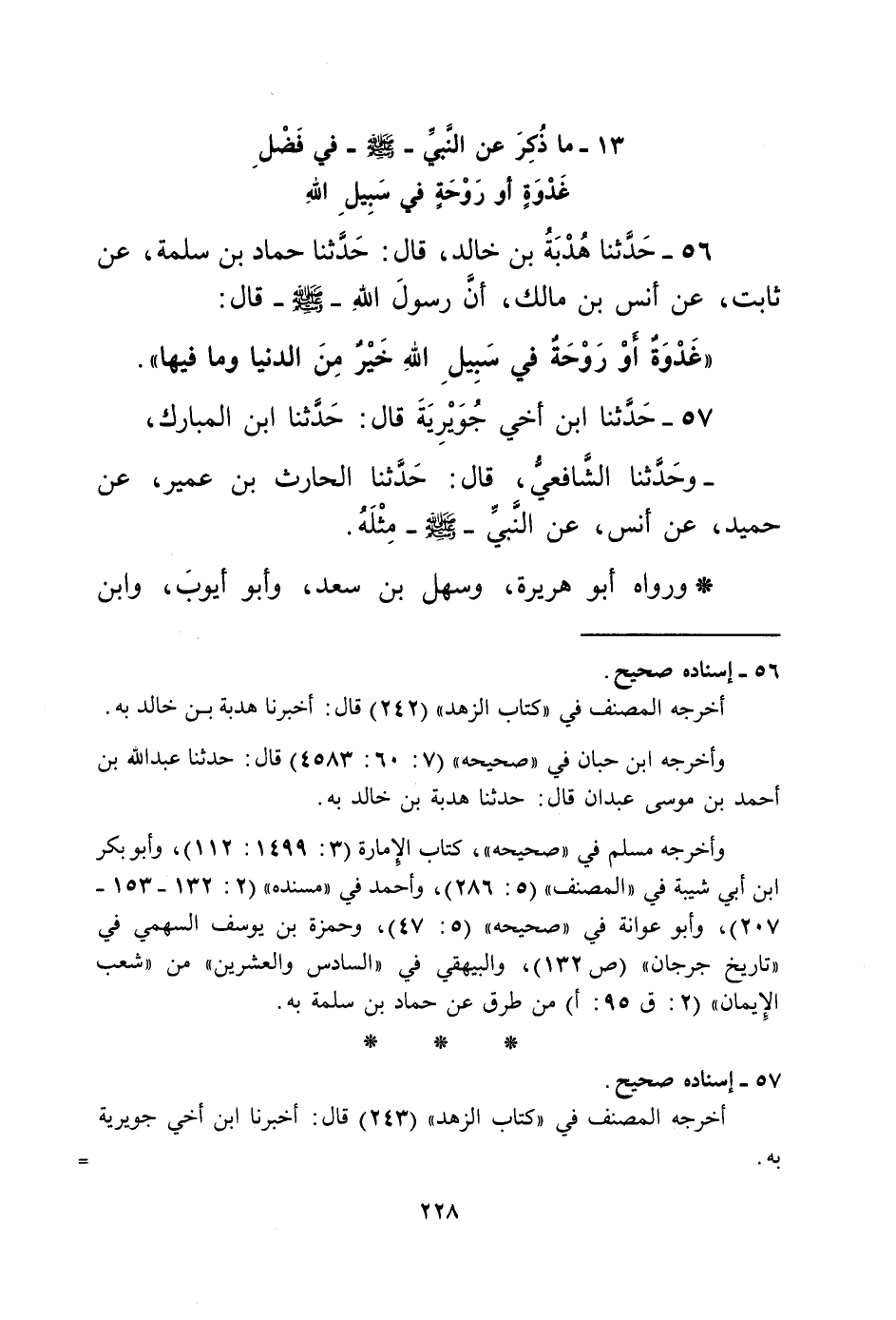 56 - حَدَّثَنَا هُدْبَةُ بْنُ خَالِدٍ، قَالَ: حَدَّثَنَا حَمَّادُ بْنُ سَلَمَةَ، عَنْ ثَابِتٍ، عَنْ أَنَسِ بْنِ مَالِكٍ، أَنَّ رَسُولَ اللَّهِ صَلَّى اللهُ عَلَيْهِ وَسَلَّمَ قَالَ: «§غَدْوَةٌ أَوْ رَوْحَةٌ فِي سَبِيلِ اللَّهِ خَيْرٌ مِنَ الدُّنْيَا وَمَا فِيهَا»
