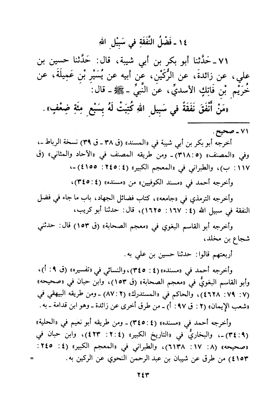 71 - حَدَّثَنَا أَبُو بَكْرِ بْنُ أَبِي شَيْبَةَ، قَالَ: حَدَّثَنَا حُسَيْنُ بْنُ عَلِيٍّ، عَنْ زَائِدَةَ، عَنِ الرُّكَيْنِ، عَنْ أَبِيهِ، عَنْ يَسِيرِ بْنِ عَمِيلَةَ، عَنْ خُرَيْمِ بْنِ فَاتِكٍ الْأَسَدِيِّ، عَنِ النَّبِيِّ صَلَّى اللهُ عَلَيْهِ وَسَلَّمَ قَالَ: «§مَنْ أَنْفَقَ نَفَقَةً فِي سَبِيلِ اللَّهِ كُتِبَتْ لَهُ بِسَبْعِ مِائَةِ ضِعْفٍ»