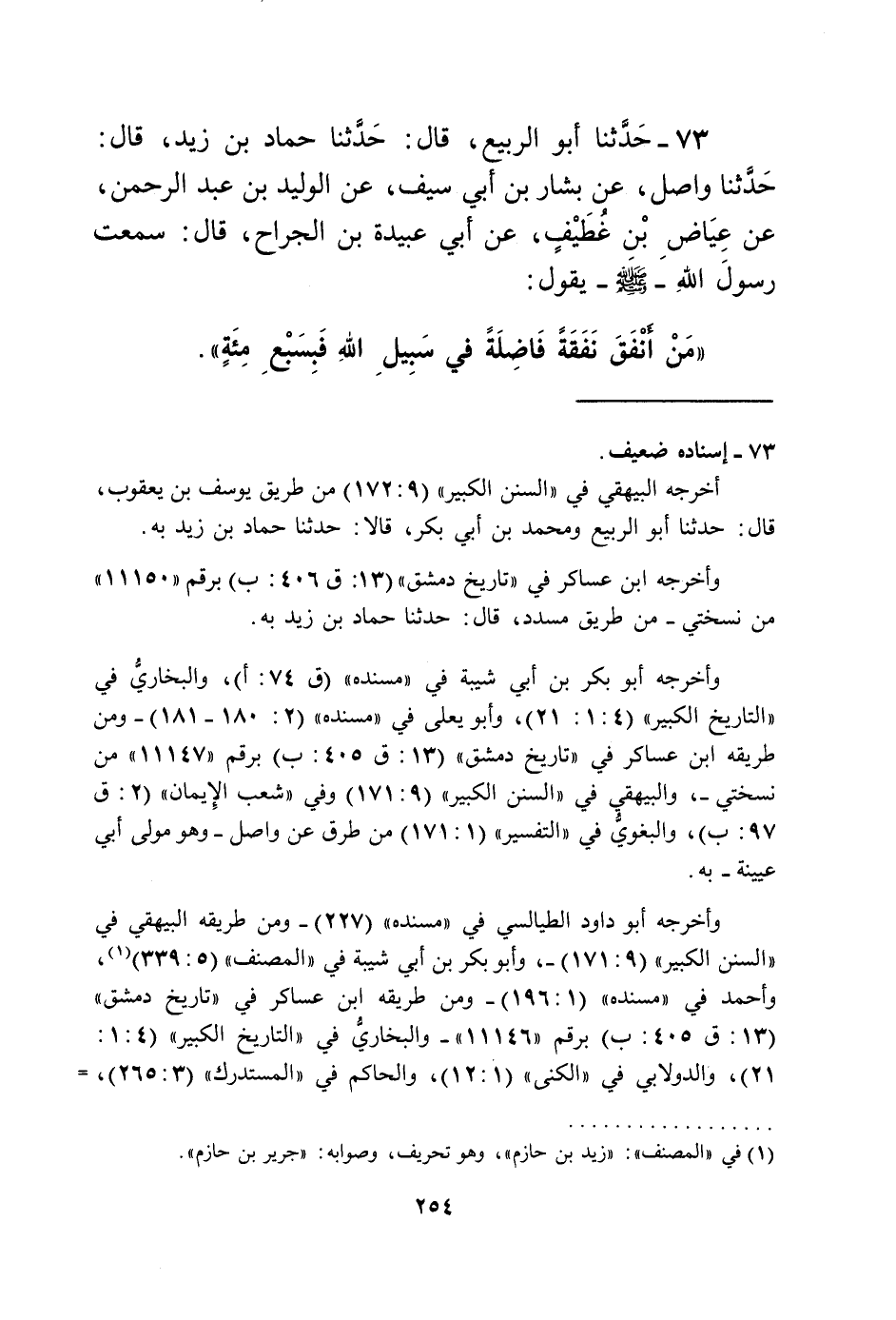 73 - حَدَّثَنَا أَبُو الرَّبِيعِ، قَالَ: حَدَّثَنَا حَمَّادُ بْنُ زَيْدٍ، قَالَ: حَدَّثَنَا وَاصِلٌ، عَنْ بَشَّارِ بْنِ أَبِي سَيْفٍ، عَنِ الْوَلِيدِ بْنِ عَبْدِ الرَّحْمَنِ، عَنْ عِيَاضِ بْنِ غُطَيْفٍ، عَنْ أَبِي عُبَيْدَةَ بْنِ الْجَرَّاحِ قَالَ: سَمِعْتُ رَسُولَ اللَّهِ صَلَّى اللهُ عَلَيْهِ وَسَلَّمَ يَقُولُ: «§مَنْ أَنْفَقَ نَفَقَةً فَاضِلَةً فِي سَبِيلِ اللَّهِ فَبِسَبْعِ مِائَةٍ»