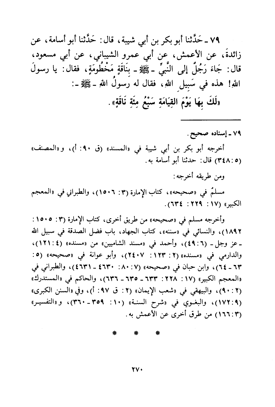 79 - حَدَّثَنَا أَبُو بَكْرِ بْنُ أَبِي شَيْبَةَ، قَالَ: حَدَّثَنَا أَبُو أُسَامَةَ، عَنْ زَائِدَةَ، عَنِ الْأَعْمَشِ، عَنْ أَبِي عَمْرٍو الشَّيْبَانِيِّ، عَنْ أَبِي مَسْعُودٍ، قَالَ: جَاءَ رَجُلٌ إِلَى النَّبِيِّ صَلَّى اللهُ عَلَيْهِ وَسَلَّمَ بِنَاقَةٍ مَخْطُومَةٍ فَقَالَ: يَا رَسُولَ اللَّهِ، هَذِهِ فِي سَبِيلِ اللَّهِ، فَقَالَ لَهُ رَسُولُ اللَّهِ صَلَّى اللهُ عَلَيْهِ وَسَلَّمَ: «§لَكَ بِهَا يَوْمَ الْقِيَامَةِ سَبْعُ مِائَةِ نَاقَةٍ»