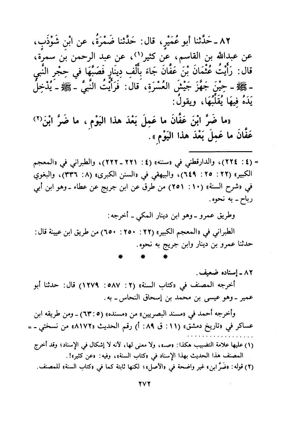 82 - حَدَّثَنَا أَبُو عُمَيْرٍ، قَالَ: حَدَّثَنَا ضَمْرَةُ، عَنِ ابْنِ شَوْذَبٍ، عَنْ عَبْدِ اللَّهِ بْنِ الْقَاسِمِ، عَنْ كَثِيرٍ، عَنْ عَبْدِ الرَّحْمَنِ بْنِ سَمُرَةَ قَالَ: رَأَيْتُ عُثْمَانَ بْنَ عَفَّانَ جَاءَ بِأَلْفِ دِينَارٍ فَصَبَّهَا فِي حِجْرِ النَّبِيِّ صَلَّى اللهُ عَلَيْهِ وَسَلَّمَ حِينَ جَهَّزَ جَيْشَ الْعُسْرَةِ قَالَ: فَرَأَيْتُ النَّبِيَّ صَلَّى اللهُ عَلَيْهِ وَسَلَّمَ يُدْخِلُ يَدَهُ فِيهَا يُقَبِّلُهَا وَيَقُولُ: «§مَا ضَرَّ ابْنَ عَفَّانَ مَا عَمِلَ بَعْدَ هَذَا الْيَوْمِ، مَا ضَرَّ ابْنَ عَفَّانَ مَا عَمِلَ بَعْدَ هَذَا الْيَوْمِ»