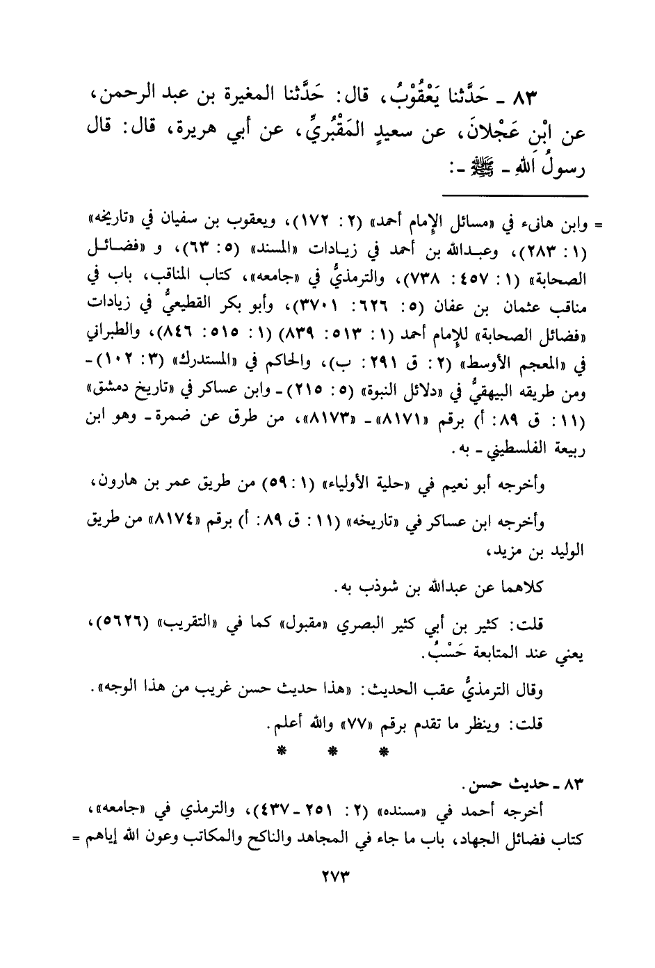 83 - حَدَّثَنَا يَعْقُوبُ، قَالَ: حَدَّثَنَا الْمُغِيرَةُ بْنُ عَبْدِ الرَّحْمَنِ، عَنِ ابْنِ عَجْلَانَ، عَنْ سَعِيدٍ الْمَقْبُرِيِّ، عَنْ أَبِي هُرَيْرَةَ قَالَ: قَالَ رَسُولُ اللَّهِ صَلَّى اللهُ عَلَيْهِ وَسَلَّمَ -[274]-: " §ثَلَاثَةٌ حَقٌّ عَلَى اللَّهِ عَوْنُهُمُ: الْمُجَاهِدُ فِي سَبِيلِ اللَّهِ، وَالنَّاكِحُ يُرِيدُ الْعَفَافَ، وَالْمُكَاتَبُ يُرِيدُ الْأَدَاءَ "