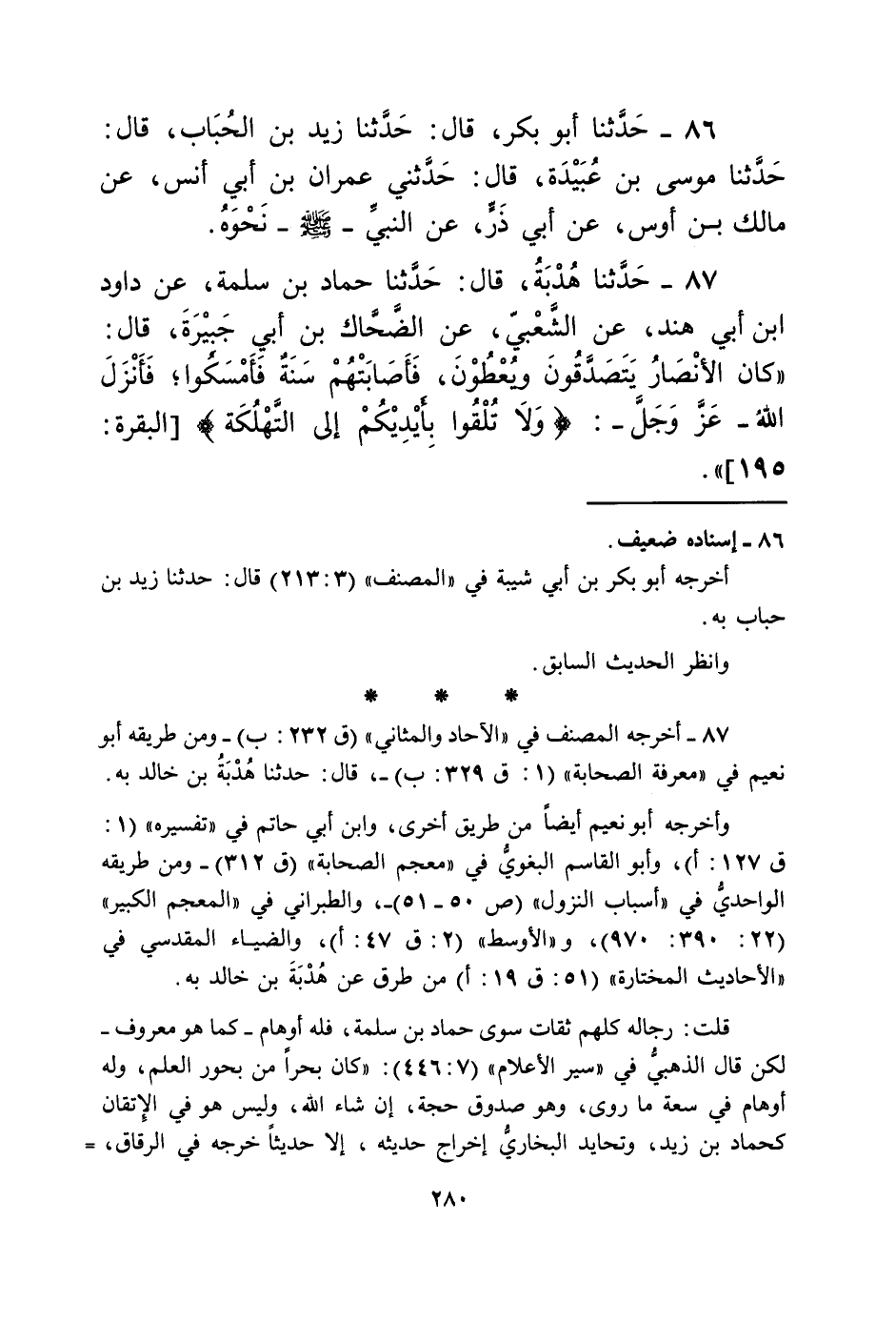 87 - حَدَّثَنَا هُدْبَةُ، قَالَ: حَدَّثَنَا حَمَّادُ بْنُ سَلَمَةَ، عَنْ دَاوُدَ بْنِ أَبِي هِنْدَ، عَنِ الشَّعْبِيِّ، عَنِ الضَّحَّاكِ بْنِ أَبِي جَبِيرَةَ، قَالَ: " §كَانَ الْأَنْصَارُ يَتَصَدَّقُونَ وَيُعْطُونَ، فَأَصَابَتْهُمْ سَنَةً، فَأَمْسَكُوا، فَأَنْزَلَ اللَّهُ عَزَّ وَجَلَّ: {وَلَا تُلْقُوا بِأَيْدِيكُمْ إِلَى التَّهْلُكَةِ} [البقرة: 195] "