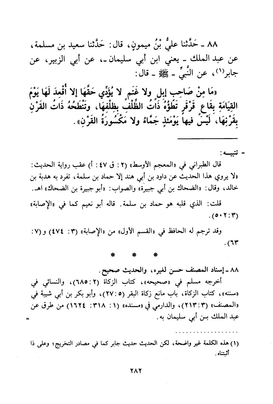 88 - حَدَّثَنَا عَلِيُّ بْنُ مَيْمُونٍ، قَالَ: حَدَّثَنَا سَعِيدُ بْنُ مَسْلَمَةَ، عَنْ عَبْدِ الْمَلِكِ يَعْنِي ابْنَ أَبِي سُلَيْمَانَ، عَنْ أَبِي الزُّبَيْرِ، عَنْ جَابِرٍ، عَنِ النَّبِيِّ صَلَّى اللهُ عَلَيْهِ وَسَلَّمَ قَالَ: «§مَا مِنْ صَاحِبِ إِبِلٍ وَلَا غَنَمٍ لَا يُؤَدِّي حَقَّهَا، إِلَّا أُقْعِدَ لَهَا يَوْمَ الْقِيَامَةِ بِقَاعٍ قَرْقَرٍ تَطَؤُهُ ذَاتُ الظِّلْفِ بِظِلْفِهَا، وَتَنْطَحُهُ ذَاتُ الْقَرْنِ بِقَرْنِهَا، لَيْسَ فِيهَا يَوْمَئِذٍ جَمَّاءُ، وَلَا مَكْسُورَةُ الْقَرْنِ» -[283]-، قَالَ: فَقُلْنَا: يَا رَسُولَ اللَّهِ، وَمَا حَقُّهَا؟ قَالَ: «إِطْرَاقُ فَحْلِهَا، وَإِعَارَةُ دَلْوِهَا، وَحَلْبُهَا عَلَى الْمَاءِ، وَمِنْحَتُهَا وَحَمْلٌ عَلَيْهَا فِي سَبِيلِ اللَّهِ»