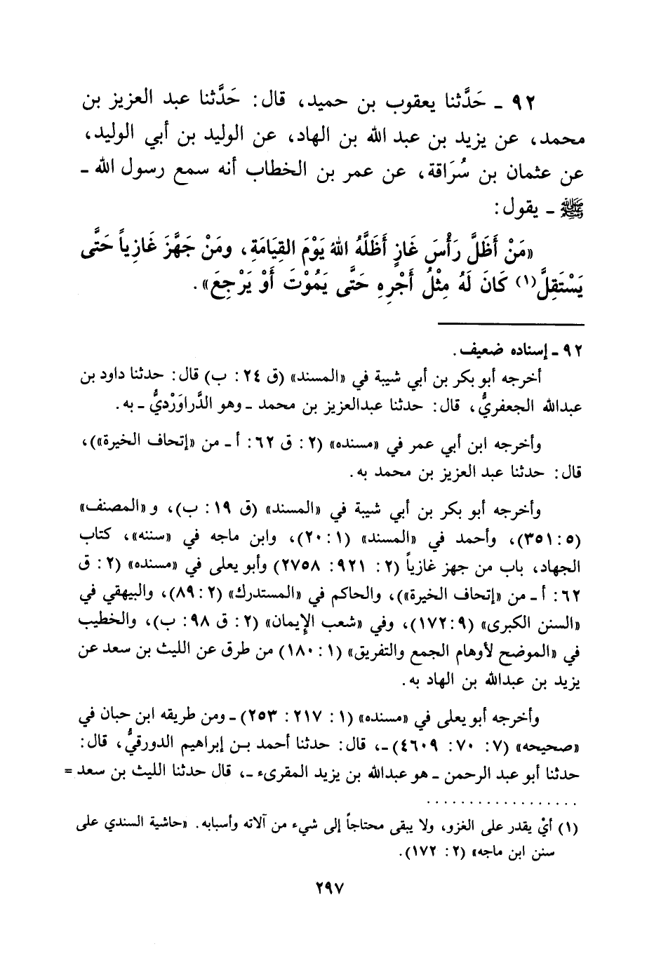 92 - حَدَّثَنَا يَعْقُوبُ بْنُ حُمَيْدٍ، قَالَ: حَدَّثَنَا عَبْدُ الْعَزِيزِ بْنُ مُحَمَّدٍ، عَنْ يَزِيدَ بْنِ عَبْدِ اللَّهِ بْنِ الْهَادِ، عَنِ الْوَلِيدِ بْنِ أَبِي الْوَلِيدِ، عَنْ عُثْمَانَ بْنِ سُرَاقَةَ، عَنْ عُمَرَ بْنِ الْخَطَّابِ أَنَّهُ سَمِعَ رَسُولَ اللَّهِ صَلَّى اللهُ عَلَيْهِ وَسَلَّمَ يَقُولُ: «§مَنْ أَظَلَّ رَأْسَ غَازٍ أَظَلَّهُ اللَّهُ يَوْمَ الْقِيَامَةِ، وَمَنْ جَهَّزَ غَازِيًا حَتَّى يَسْتَقِلَّ كَانَ لَهُ مِثْلُ أَجْرِهِ حَتَّى يَمُوتَ أَوْ يَرْجِعَ»