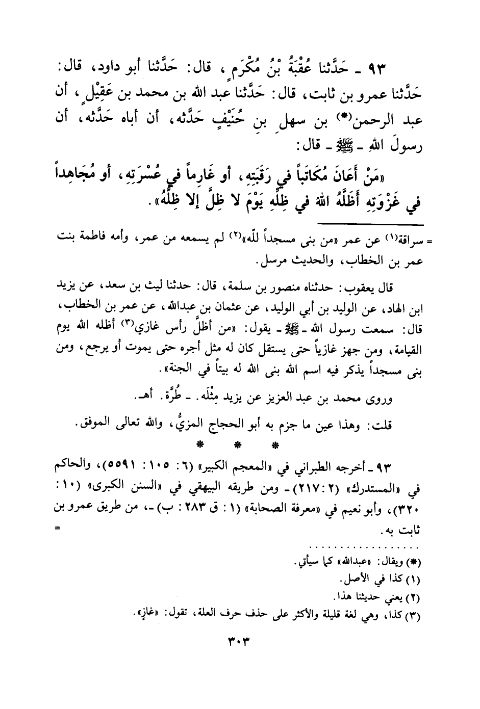 93 - حَدَّثَنَا عُقْبَةُ بْنُ مُكْرَمٍ، قَالَ: حَدَّثَنَا أَبُو دَاوُدَ، قَالَ: حَدَّثَنَا عَمْرُو بْنُ ثَابِتٍ، قَالَ: حَدَّثَنَا عَبْدُ اللَّهِ بْنُ مُحَمَّدِ بْنِ عَقِيلٍ، أَنَّ عَبْدَ الرَّحْمَنِ بْنَ سَهْلِ بْنِ حُنَيْفٍ، حَدَّثَهُ، أَنَّ أَبَاهُ حَدَّثَهُ، أَنَّ رَسُولَ اللَّهِ صَلَّى اللهُ عَلَيْهِ وَسَلَّمَ قَالَ: «§مَنْ أَعَانَ مُكَاتَبًا فِي رَقَبَتِهِ، أَوْ غَارِمًا فِي عُسْرَتِهِ، أَوْ مُجَاهِدًا فِي غَزْوَتِهِ، أَظَلَّهُ اللَّهُ فِي ظِلِّهِ، يَوْمَ لَا ظِلَّ إِلَّا ظِلُّهُ»