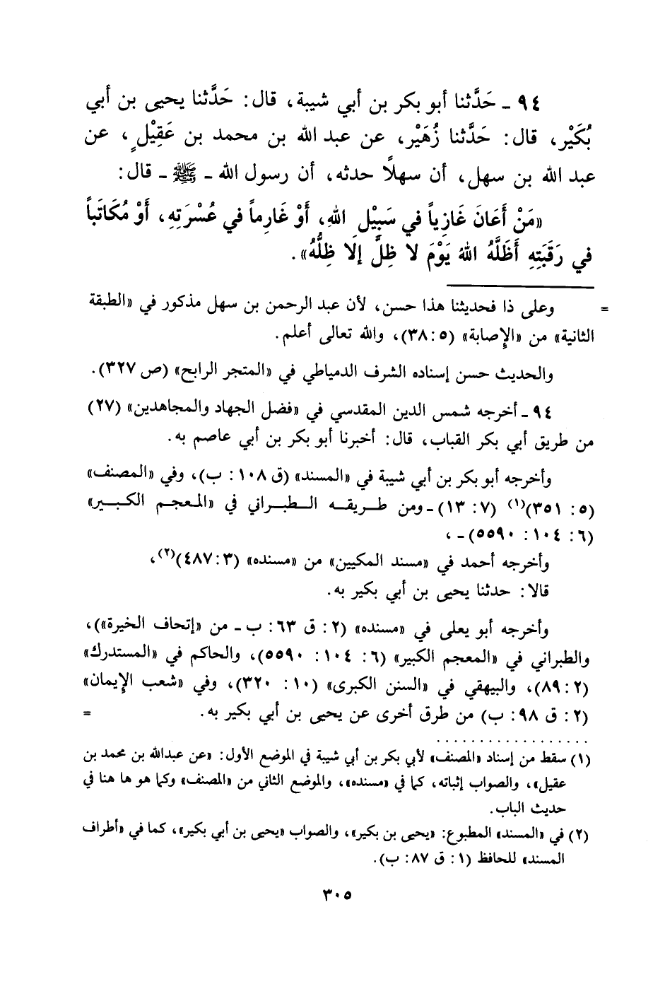 94 - حَدَّثَنَا أَبُو بَكْرِ بْنُ أَبِي شَيْبَةَ، قَالَ: حَدَّثَنَا يَحْيَى بْنُ أَبِي بُكَيْرٍ، قَالَ: حَدَّثَنَا زُهَيْرٌ، عَنْ عَبْدِ اللَّهِ بْنِ مُحَمَّدِ بْنِ عَقِيلٍ، عَنْ عَبْدِ اللَّهِ بْنِ سَهْلٍ، أَنَّ سَهْلًا حَدَّثَهُ أَنَّ رَسُولَ اللَّهِ صَلَّى اللهُ عَلَيْهِ وَسَلَّمَ قَالَ: «§مَنْ أَعَانَ غَازِيًا فِي سَبِيلِ اللَّهِ، أَوْ غَارِمًا فِي عُسْرَتِهِ، أَوْ مُكَاتَبًا فِي رَقَبَتِهِ، أَظَلَّهُ اللَّهُ يَوْمَ لَا ظِلَّ إِلَّا ظِلُّهُ»