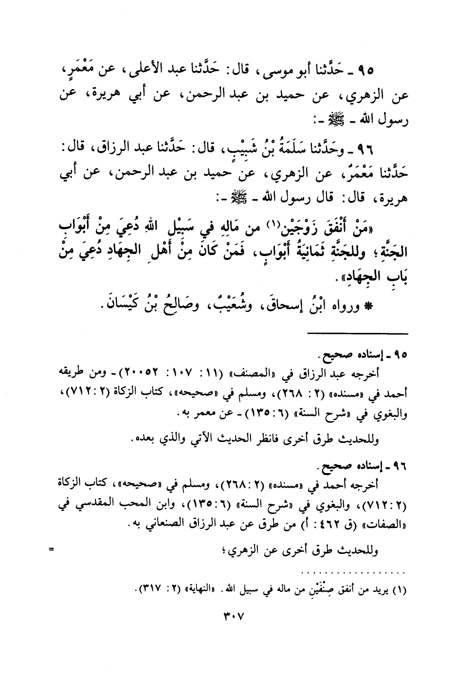 96 - وَحَدَّثَنَا سَلَمَةُ بْنُ شَبِيبٍ، قَالَ: حَدَّثَنَا عَبْدُ الرَّزَّاقِ، قَالَ: حَدَّثَنَا مَعْمَرٌ، عَنِ الزُّهْرِيِّ، عَنْ حُمَيْدِ بْنِ عَبْدِ الرَّحْمَنِ، عَنْ أَبِي هُرَيْرَةَ قَالَ: قَالَ رَسُولُ اللَّهِ صَلَّى اللهُ عَلَيْهِ وَسَلَّمَ: «§مَنْ أَنْفَقَ زَوْجَيْنِ مِنْ مَالِهِ فِي سَبِيلِ اللَّهِ، دُعِيَ مِنْ أَبْوَابِ الْجَنَّةِ، وَلِلْجَنَّةِ ثَمَانِيَةُ أَبْوَابٍ، فَمَنْ كَانَ مِنْ أَهْلِ الْجِهَادِ دُعِيَ مِنْ بَابِ الْجِهَادِ» وَرَوَاهُ ابْنُ إِسْحَاقَ، وَشُعَيْبٌ، وَصَالِحُ بْنُ كَيْسَانَ