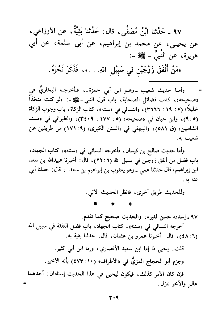 97 - حَدَّثَنَا ابْنُ مُصَفَّى، قَالَ: حَدَّثَنَا بَقِيَّةُ، عَنِ الْأَوْزَاعِيِّ، عَنْ يَحْيَى، عَنْ مُحَمَّدِ بْنِ إِبْرَاهِيمَ، عَنْ أَبِي سَلَمَةَ، عَنْ أَبِي هُرَيْرَةَ، عَنِ النَّبِيِّ صَلَّى اللهُ عَلَيْهِ وَسَلَّمَ: «§مَنْ أَنْفَقَ زَوْجَيْنِ فِي سَبِيلِ اللَّهِ» فَذَكَرَ نَحْوَهُ