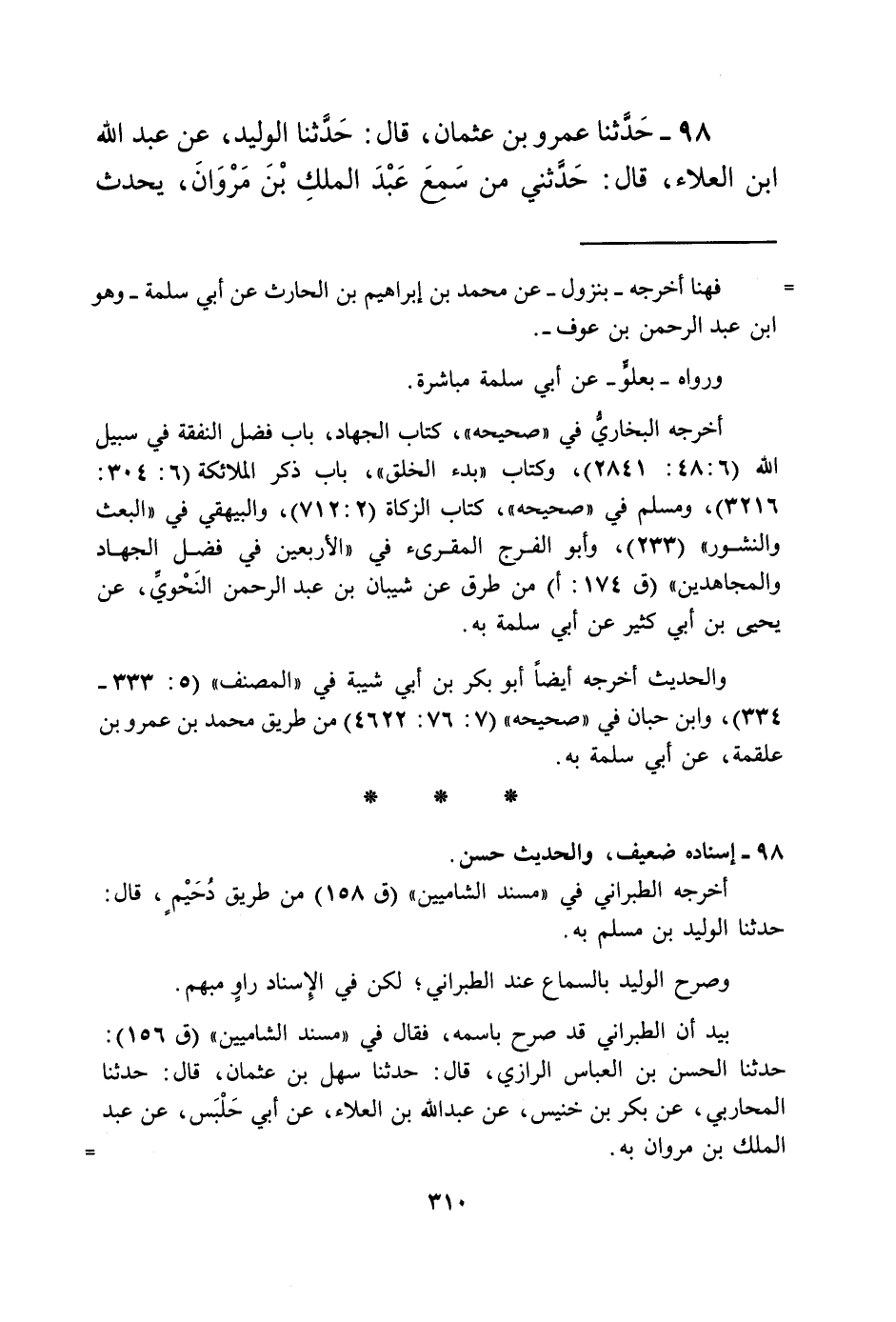 98 - حَدَّثَنَا عَمْرُو بْنُ عُثْمَانَ، قَالَ: حَدَّثَنَا الْوَلِيدُ، عَنْ عَبْدِ اللَّهِ بْنِ الْعَلَاءِ، قَالَ: حَدَّثَنِي مَنْ سَمِعَ عَبْدَ الْمَلِكِ بْنَ مَرْوَانَ يُحَدِّثُ -[311]- عَلَى الْمِنْبَرِ عَنْ أَبِي هُرَيْرَةَ، عَنِ النَّبِيِّ صَلَّى اللهُ عَلَيْهِ وَسَلَّمَ قَالَ: «§مَنْ لَمْ يَغْزُ أَوْ يُجَهِّزْ غَازِيًا، أَوْ يَخْلُفْ غَازِيًا فِي أَهْلِهِ بِخَيْرٍ، أَصَابَهُ اللَّهُ بِقَارِعَةٍ قَبْلَ يَوْمِ الْقِيَامَةِ»