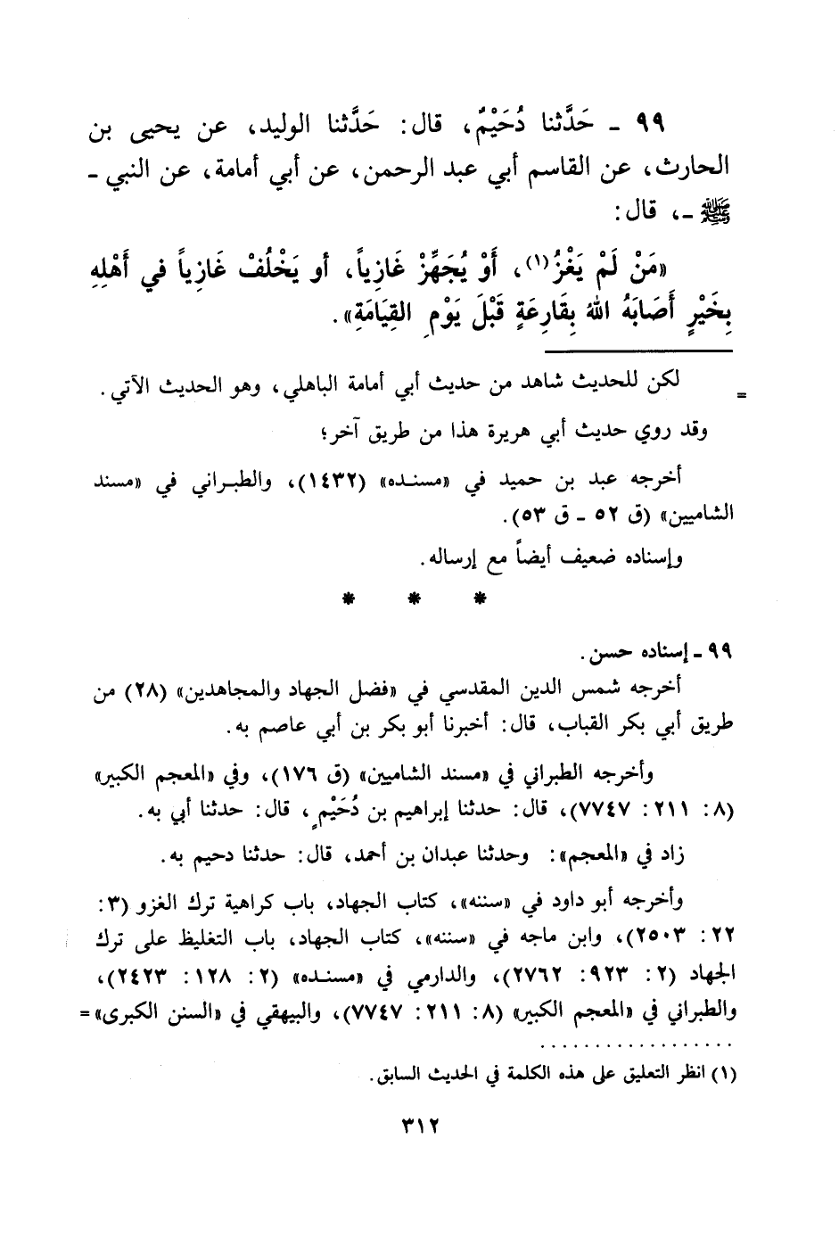99 - حَدَّثَنَا دُحَيْمٌ، قَالَ: حَدَّثَنَا الْوَلِيدُ، عَنْ يَحْيَى بْنِ الْحَارِثِ، عَنِ الْقَاسِمِ أَبِي عَبْدِ الرَّحْمَنِ، عَنْ أَبِي أُمَامَةَ، عَنِ النَّبِيِّ صَلَّى اللهُ عَلَيْهِ وَسَلَّمَ قَالَ: «§مَنْ لَمْ يَغْزُ أَوْ يُجَهِّزْ غَازِيًا، أَوْ يَخْلُفْ غَازِيًا فِي أَهْلِهِ بِخَيْرٍ أَصَابَهُ اللَّهُ بِقَارِعَةٍ قَبْلَ يَوْمِ الْقِيَامَةِ»