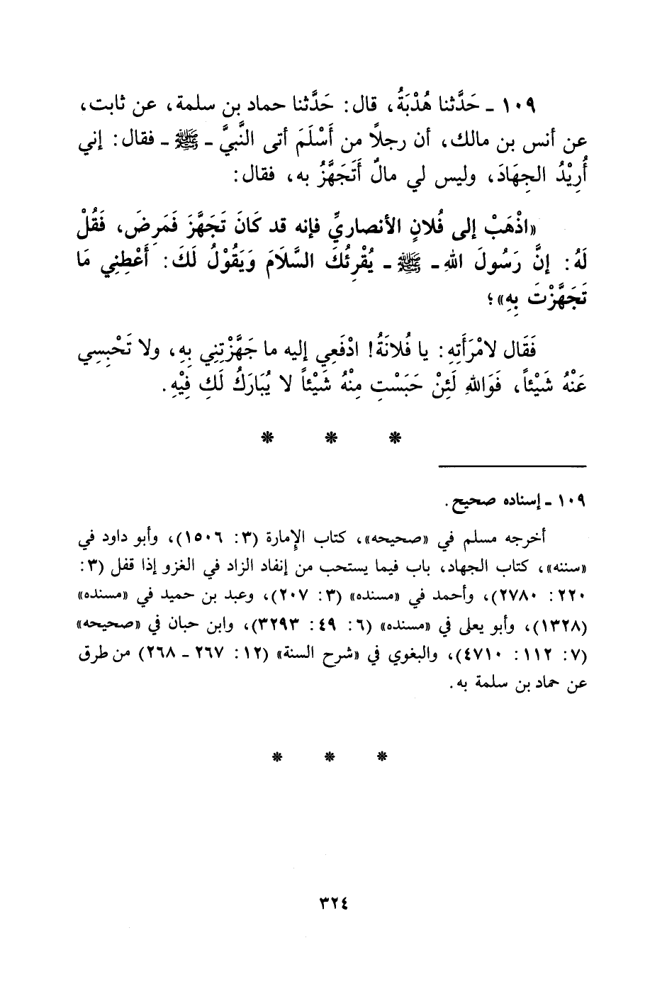 109 - حَدَّثَنَا هُدْبَةُ، قَالَ: حَدَّثَنَا حَمَّادُ بْنُ سَلَمَةَ، عَنْ ثَابِتٍ، عَنْ أَنَسِ بْنِ مَالِكٍ، أَنَّ رَجُلًا مِنْ أَسْلَمَ أَتَى النَّبِيَّ صَلَّى اللهُ عَلَيْهِ وَسَلَّمَ فَقَالَ: إِنِّي أُرِيدُ الْجِهَادَ، وَلَيْسَ لِي مَالٌ أَتَجَهَّزُ بِهِ، فَقَالَ: " اذْهَبْ إِلَى فُلَانٍ الْأَنْصَارِيِّ، فَإِنَّهُ §قَدْ كَانَ تَجَهَّزَ فَمَرِضَ، فَقُلْ لَهُ: إِنَّ رَسُولَ اللَّهِ صَلَّى اللهُ عَلَيْهِ وَسَلَّمَ يُقْرِئُكَ السَّلَامَ، وَيَقُولُ لَكَ: أَعْطِنِي مَا تَجَهَّزْتَ بِهِ "، فَقَالَ لِامْرَأَتِهِ: يَا فُلَانَةُ، ادْفَعِي إِلَيْهِ مَا جَهَّزْتِنِي بِهِ، وَلَا تَحْبِسِي عَنْهُ شَيْئًا، فَوَاللَّهِ لَئِنْ حَبَسْتِ مِنْهُ شَيْئًا، لَا يُبَارَكُ لَكِ فِيهِ