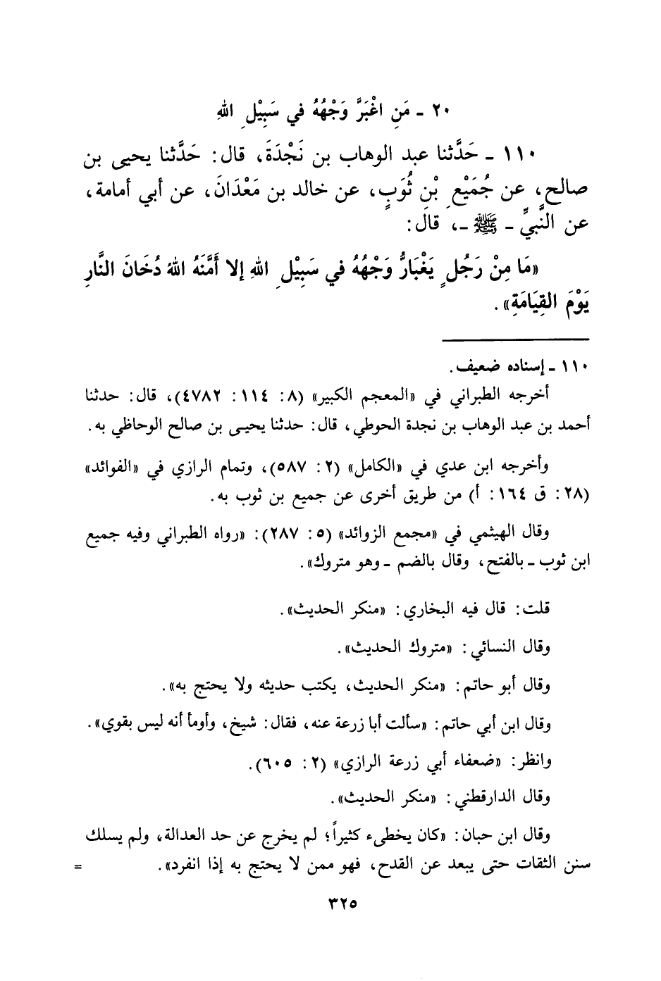 110 - حَدَّثَنَا عَبْدُ الْوَهَّابِ بْنُ نَجْدَةَ، قَالَ: حَدَّثَنَا يَحْيَى بْنُ صَالِحٍ، عَنْ جُمَيْعِ بْنِ ثَوْبٍ، عَنْ خَالِدِ بْنِ مَعْدَانَ، عَنْ أَبِي أُمَامَةَ، عَنِ النَّبِيِّ صَلَّى اللهُ عَلَيْهِ وَسَلَّمَ قَالَ: «§مَا مِنْ رَجُلٍ يَغْبَارُّ وَجْهُهُ فِي سَبِيلِ اللَّهِ، إِلَّا أَمَّنَهُ اللَّهُ دُخَانَ النَّارِ يَوْمَ الْقِيَامَةِ»
