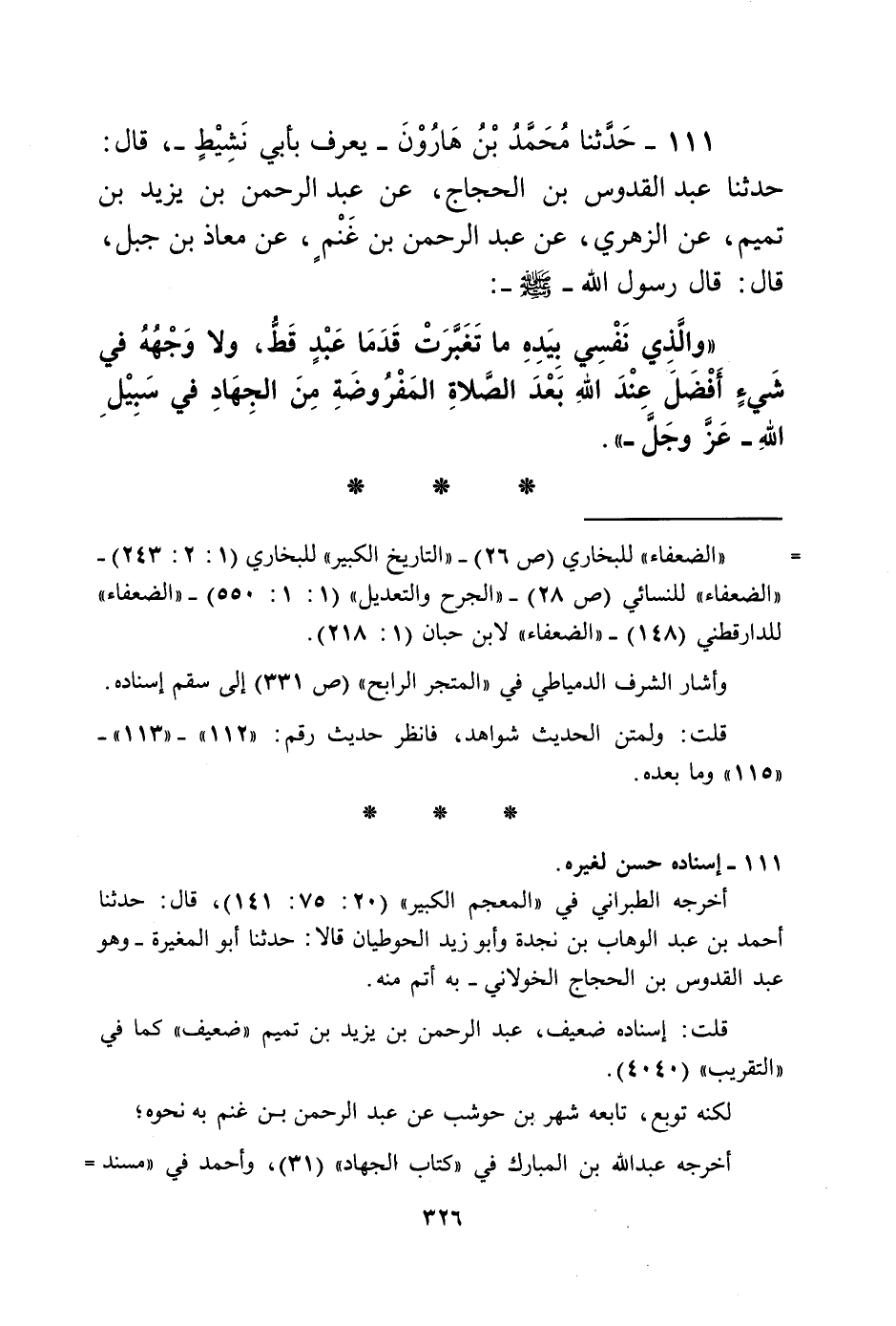 111 - حَدَّثَنَا مُحَمَّدُ بْنُ هَارُونَ يُعْرَفُ بِأَبِي نَشِيطٍ قَالَ: حَدَّثَنَا عَبْدُ الْقُدُّوسِ بْنُ الْحَجَّاجِ، عَنْ عَبْدِ الرَّحْمَنِ بْنِ يَزِيدَ بْنِ تَمِيمٍ، عَنِ الزُّهْرِيِّ، عَنْ عَبْدِ الرَّحْمَنِ بْنِ غَنْمٍ، عَنْ مُعَاذِ بْنِ جَبَلٍ قَالَ: قَالَ رَسُولُ اللَّهِ صَلَّى اللهُ عَلَيْهِ وَسَلَّمَ: «§وَالَّذِي نَفْسِي بِيَدِهِ، مَا تَغَبَّرَتْ قَدَمَا عَبْدٍ قَطُّ، وَلَا وَجْهُهُ فِي شَيْءٍ أَفْضَلَ عِنْدَ اللَّهِ بَعْدَ الصَّلَاةِ الْمَفْرُوضَةِ مِنَ الْجِهَادِ فِي سَبِيلِ اللَّهِ عَزَّ وَجَلَّ»