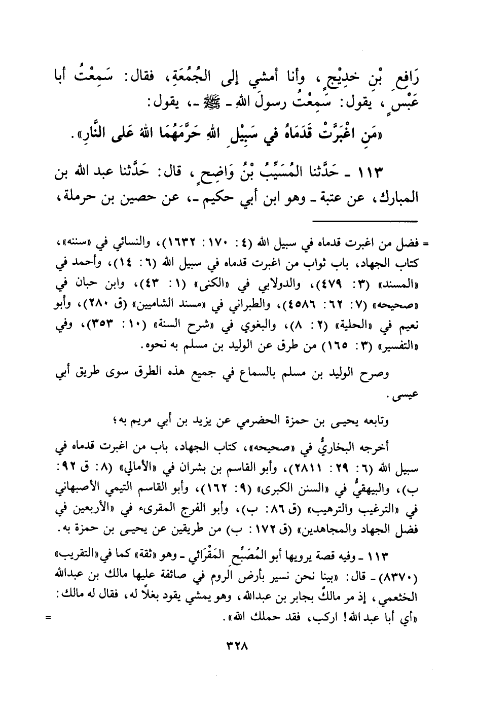 113 - حَدَّثَنَا الْمُسَيَّبُ بْنُ وَاضِحٍ، قَالَ: حَدَّثَنَا عَبْدُ اللَّهِ بْنُ الْمُبَارَكِ، عَنْ عُتْبَةَ وَهُوَ ابْنُ أَبِي حَكِيمٍ، عَنْ حُصَيْنِ بْنِ حَرْمَلَةَ -[329]-، عَنْ أَبِي الْمُصَبِّحِ الْمُقْرَائِيِّ، عَنْ جَابِرِ بْنِ عَبْدِ اللَّهِ قَالَ: قَالَ رَسُولُ اللَّهِ صَلَّى اللهُ عَلَيْهِ وَسَلَّمَ: «§مَنِ اغْبَرَّتْ قَدَمَاهُ فِي سَبِيلِ اللَّهِ حَرَّمَهُمَا اللَّهُ عَلَى النَّارِ»