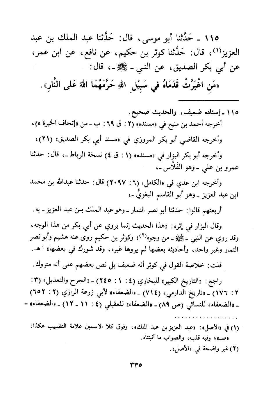 115 - حَدَّثَنَا أَبُو مُوسَى، قَالَ: حَدَّثَنَا عَبْدُ الْمَلِكِ بْنُ عَبْدِ الْعَزِيزِ، قَالَ: حَدَّثَنَا كَوْثَرُ بْنُ حَكِيمٍ، عَنْ نَافِعٍ، عَنِ ابْنِ عُمَرَ، عَنْ أَبِي بَكْرٍ الصِّدِّيقِ، عَنِ النَّبِيِّ صَلَّى اللهُ عَلَيْهِ وَسَلَّمَ قَالَ: «§مَنِ اغْبَرَّتْ قَدَمَاهُ فِي سَبِيلِ اللَّهِ حَرَّمَهُمَا اللَّهُ عَلَى النَّارِ»